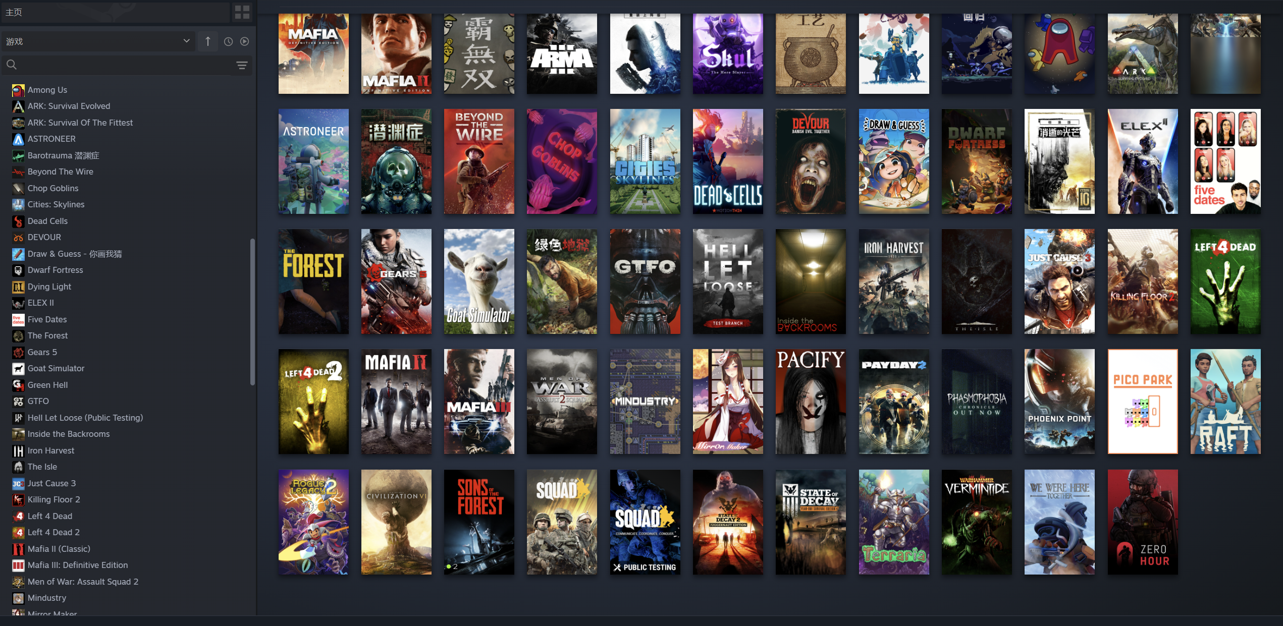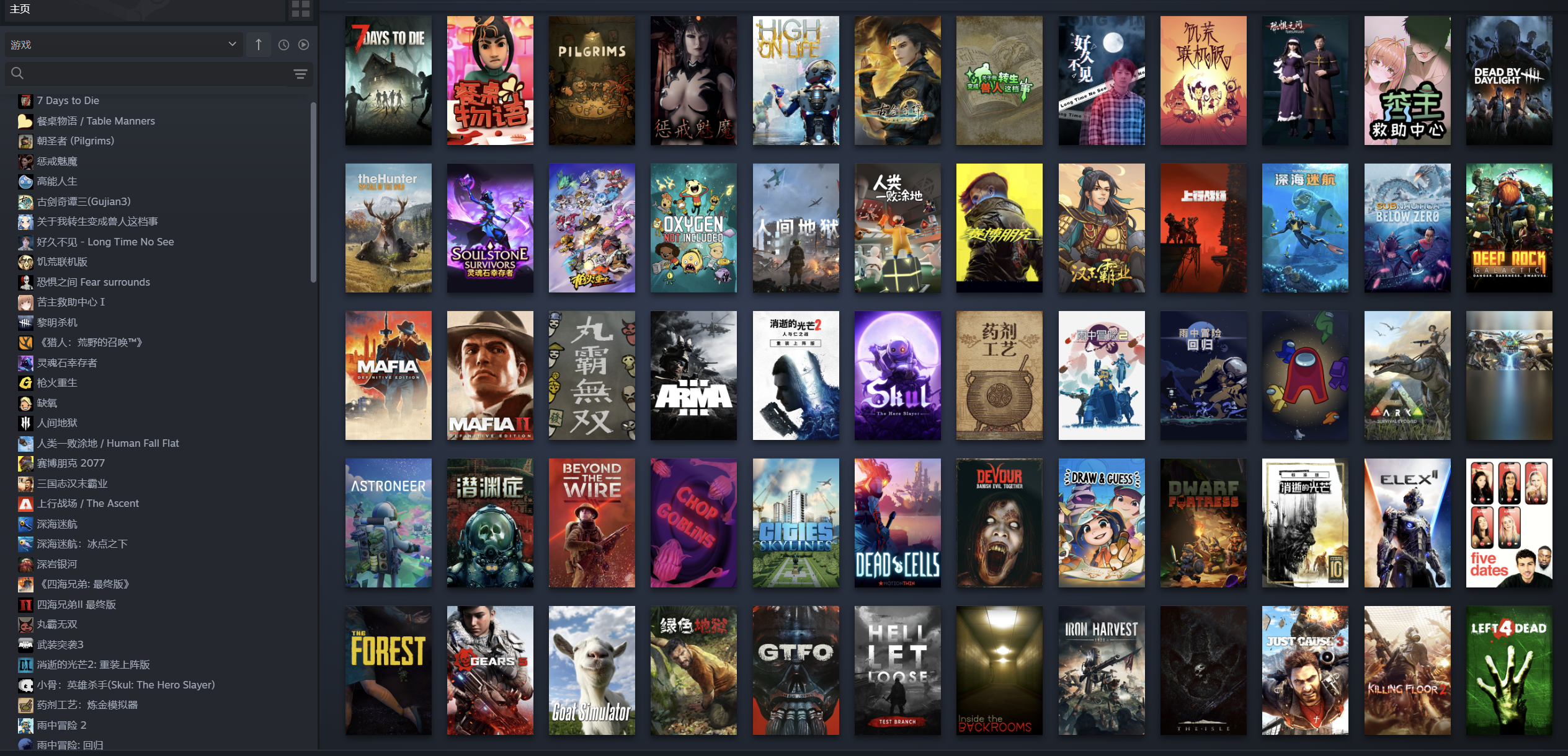 森林之子/迷失森林2(Sons Of The Forest)、消逝的光芒2人与仁之战(Dying Light 2)、赛博朋克2077《赛博朋克2077往日之影》、战术小队(Squad)、矮人要塞(Dwarf Fortress)、越过壕沟( Beyond the Wire)、雨中冒险2(Risk of Rain 2)、雨中冒险回归(Risk of Rain Returns)、生命高度(High On Life)、ELEX II、求生之路2(Left 4 Dead 2)、战争机器5(Gears 5)、上行战场(The Ascent)盗贼遗产(Rogue Legacy 2)、恐鬼症/幽灵恐怖(Phasmophobia)、深入后室/后室旅游团(Inside The Backrooms)、深岩银河系(Deep Rock Galactic)、收获日/2掠夺日(payday2)、钢铁收割(Iron Harvest)、 消逝的光芒加强版 信徒加强版 消失的光芒(Dying Light)、灵魂石幸存者( Soulstone Survivors)、像塑工厂(Mindustry)、正当防卫3 (Just Cause™ 3)、苦主救助中心Ⅰ、七日杀/7日杀、迷失森林 (The forest)、腐烂国度1、腐烂国度2巨霸版、杀戮空间2/杀地板2、GTFO、枪火重生、黎明杀机、死亡细胞、小骨:英雄杀手、恐惧之间、木筏生存、丛林地狱、深海迷航零度之下、深海迷航Subnautica、人类一败涂地、吞噬Devour、求生之路1、方舟生存进化、饥荒联机版、泰拉瑞拉、恐龙岛/小岛、餐桌物语、惩戒魅魔、战锤2末世鼠疫/战锤末世鼠疫2、浅渊症、好久不见、五次约会、我们也在这里、关于我转生变成兽人这档事、三国志汉末霸业、Chop Goblins、、魔镜制作大师、古剑奇谭3、你画我猜、神佑释放、缺氧、使命召唤黑色行动3、安抚、我们之间、山羊模拟器(Goat Simulator)、异星探险家( ASTRONEER)、城市天际线(Cities: Skylines Deluxe Edition)、(ASTRONEER + Soundtrack)、文明6(Sid Meier's Civilization VI)、猎人荒野的呼唤(theHunter: Call of the Wild™)、药剂工艺炼金模拟器(Potion Craft)、战争之人突击小队2(Men of War: Assault Squad 2)、凤凰点(Phoenix Point)、十字线X(Crosshair X)、武装突袭3(Arma 3)、四海兄弟最终版、四海兄弟II最终版/四海兄弟2、四海兄弟III最终版/四海兄弟3、朝圣者 (Pilgrims)、关键时刻(Zero Hour)