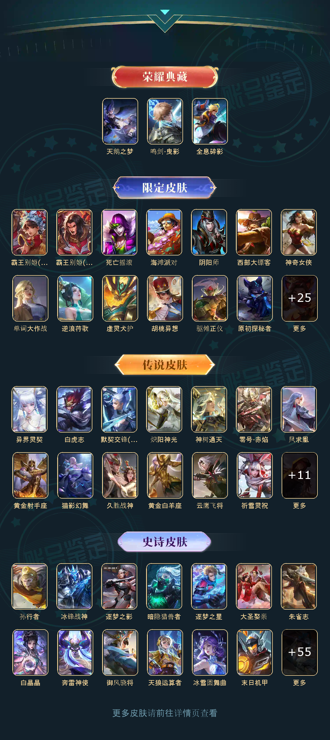 贵族等级V8,英雄数量125,典藏皮肤数3,皮肤数量236,冰锋战神/街头霸王/天鹅之梦/凤求凰/逐梦之影/神奇女侠/全息碎影/大圣娶亲/白虎志/朱雀志/久胜战神/梁祝/鸣剑·曳影/武圣/奔雷神使/孙行者/异界灵契/时雨天司