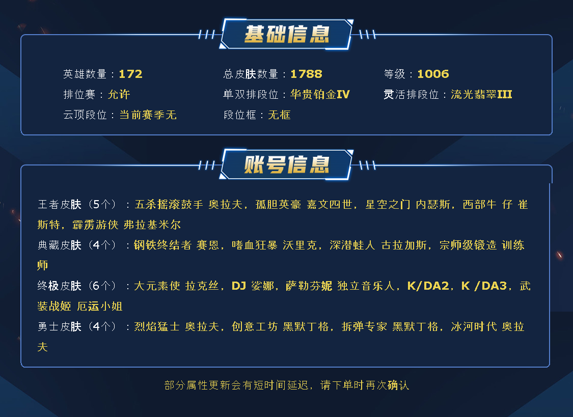 ~~喜欢记得收藏~~可排位~~1694皮全英雄丨90神话/至臻/海克斯丨黄龙瞎/龙的传人丨ig套丨edg套丨kda套丨灵魂莲华套丨神龙尊者套丨咖啡甜心套丨星之守护守套丨甜心霞洛丨玉剑男女刀丨斩星创星御星丨泳池女警佐伊丨觅心悠米金克斯丨电玩女警女枪瑞雯丨春晖嫦娥羊丝花木兰丨玫瑰+女帝+鼠年+幻灵+福牛+破败+律动+虎年+灰烬+剪纸~~租之前尽量查一下游戏ID,确保段位是您需要的,避免浪费您的时间~~请勿挂机逃跑故意送人头,谢谢合作,谢谢~~