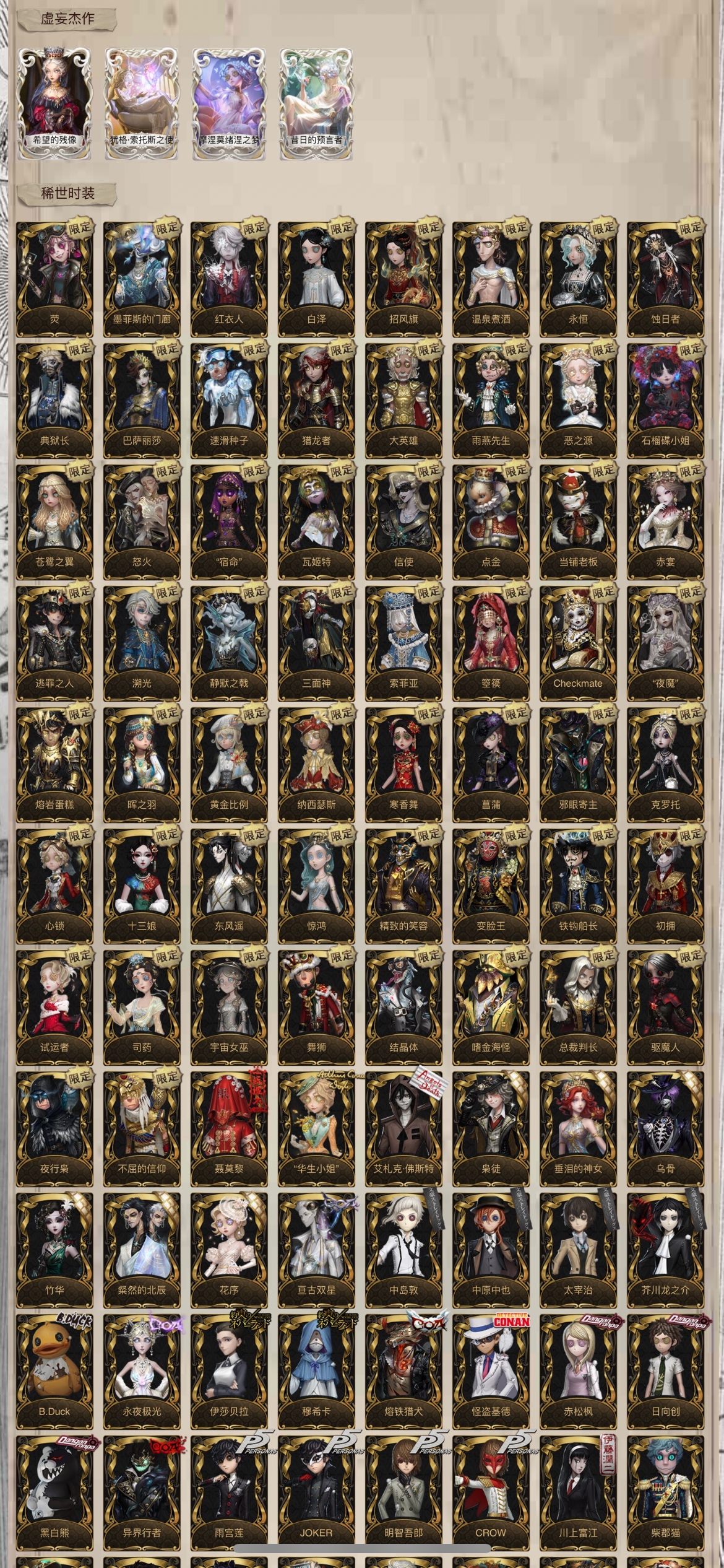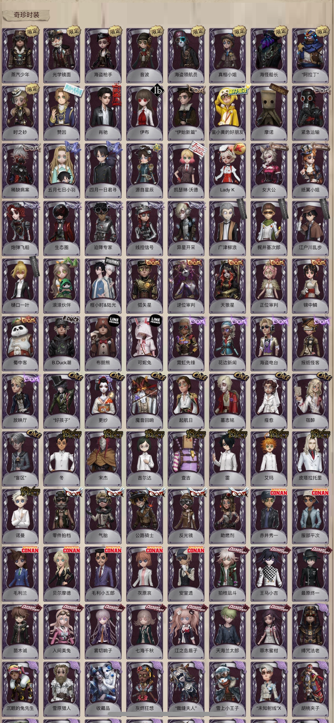 缚愿 胧夜 童话国 聂莫黎套 纸扎祠堂 石榴碟小姐 先知虚妄杰作昔日的预言者禁忌的预言 时装共享时装赤色墨水小巴特夜莺的呼唤自由之爱 盛夏光影 溯光 华生小姐 耶梦加得 司药套 瑶彩 谛仙 Crow 鬼烛 乌骨 枭徒玛利亚公理 盛夏飞盘幽灵帆墨菲斯的门廊希望的残像闻雷爪调香师虚妄摩涅莫绪涅之梦祭司虚妄杰作犹格索托斯之使 西尔菲德 招风旗套 祈雨珠 垂泪的神女 粲然的北辰 五月七日小羽 五月一日君寻 剧场主持 盖提亚之遗 箜篌 首席顾问 荧 天河 赤松枫 入间美兔 王马小吉 最原终一 全角色飞行家星空之翼守墓人半精灵骑士椰香假日歌剧演员巴萨丽莎已秒艾扎克佛斯特礼包+巨刃匕首凯瑟琳沃德 永恒 安宁 圣洁 全角色时装共享双虚妄Joker柯南满配弹丸满配文豪野犬满配梦幻岛的约定满配伊藤润二满配全归宿迷雾山庄等 三虚妄 祭司虚妄犹格索托斯之使 调香师虚妄摩涅莫绪涅之梦 虚妄盒子 信使 蚀日者 竹华 花序 亘古双星 中岛敦套 中原中也套 太宰治套 芥川龙之介套 B.duck 永夜极光 伊莎贝拉 穆希卡 熔铁猎犬 怪盗基德 日向创 黑白熊 异界行者 雨宫莲觉醒joker 明智吾郎 川上富江 红衣人 白泽 温泉煮酒 典狱长 速滑种子 猎龙者 大英雄 雨燕先生 恶之源 苍鹭之翼 怒火 宿命 瓦姬特 点金 当铺老板 赤宴 逃罪之人 静默之戟 三面神 索菲亚 夜魔 Checkmate 熔岩蛋糕 晖之羽 黄金比例 纳西瑟斯 寒香舞 菖蒲 邪眼寄主 克罗托 心锁 结晶体 十三娘 东风遥 惊鸿套 精致的笑容 小丑新春限定 铁钩船长 初拥 试运者 宇宙女巫 舞狮 嗜金海怪 总裁判长 驱魔人 夜行枭 不屈的信仰 柴郡猫 寻宝贵族 火车头 茶话会 欧律狄刻 长夜 贝拉夫人套 夜潮 拉塔托斯克 星辰 征服 尼德霍格 金纹大触 盛宴伯爵 忘川渡人套 夜来香 女武神 小红帽 不会枯萎的花 花祭 暗金蛋糕 建筑师 花嫁 白无垢 死灵师 寒霜 摩根勒菲 引路人 小人国 小丑皇 孤月骑士 海盐特调 灵犀妙探 流萤套 浴火绯花 幽灵公主 怪鸟套 渊 缔造者 亚兹拉尔 今夜不再套 菲尼克斯 海盗领航员 真相小姐 生日快乐 海盗船长 光学镜面 蒸汽少年 阿拉丁 海盗枪手 音波 时之砂 Ladyk 双一 十字路口的美少年 奥春村 新岛真 佐仓双叶 高卷杏觉醒 坂本龙司觉醒Skull 喜多川佑介 Fox 剪刀手爱德华 不速之客 金 苗木诚 罪木蜜柑 狛枝凪斗 雾切响子 七海千秋 江之岛盾子 毛利小五郎 赤井秀一 毛利兰 服部平次 灰原哀 安室透 贝尔摩德 好孩子 痊愈 更纱 宿醉 起航日 墓志铭 魔音回响 盲区 潮 布朗熊 可妮兔 程小时陆光 恶之花 正位审判 逆位审判 锦中鳞 蜀中客 教鞭 观测者 嬉命人 反光镜 公路骑士 零件拍档 气胎 助燃剂 霓虹先锋 花边新闻 海盗电台 放映厅 报纸怪客 生态圈 线控信号 炮弹飞船 自行开采 白孔雀 猩红新娘 恸哭 熊猫保育员 滚滚伙伴 小女孩满配 广津柳浪 樋口一叶 梶井基次郎 孤矢星 女大公 天狼星 纸翼小姐 迫降专家 美团外卖 麦当劳 鉴赏家等艾扎克神圣阿斯莫 黑鸦艾扎克 触碰