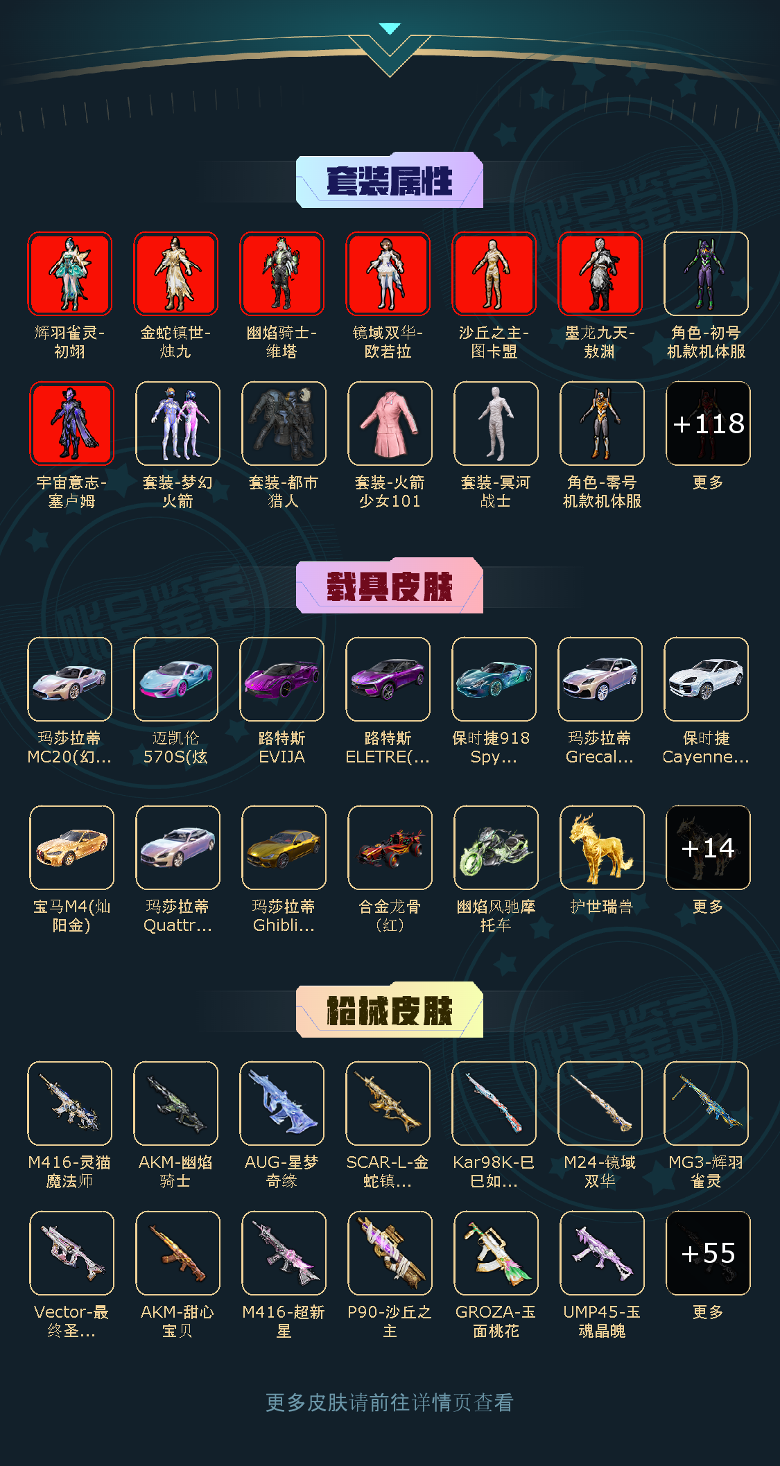 117粉,27载具,611套装,UZI-绮梦青鸾/AKM-盖世英雄/AKM-甜心宝贝/DP-28-扶摇飞仙/SCAR-L-梦幻火箭/SCAR-L-童趣迷兔/Kar98K-伏魔团/爆炸猎弓-雪梅暗香/P90-仙履奇缘/SCAR-L-甜梦小狐/平底锅-仲夏莫吉托/AWM-花间之火/M762-甜心娃娃/M416-全功率超战/GROZA-旋转彩虹/PKM-天星战神/Vector-红伞翩翩/P90-甜蜜草莓/SKS-诡面斩/SCAR-L-桃夭倾城/GROZA-香水柠檬/M416-暖熊萌萌/SPAS-12-音爆索尼克/Kar98K-圣光天使/AWM-橘柚倾心/SCAR-L-天蓬元帅/UMP45-宇宙意志/M416-心之恋语/SCAR-L-纯梦嫁纱/M24-镜域双华/平底锅-林间仙鹿/Mini14-荧光虫舞/M416-五爪金龙/DP-28-枪炮玫瑰/M24-翩跹演武/M16A4-垂柳戏鸭/AKM-炫紫旋律/AKM-白勺歌姬/Vector-灵感创作师/MG3-洛神天依/Vector-环太平洋/M416-墨龙九天/GROZA-焦糖拿铁/GROZA-玉面桃花/SLR-暗夜玫瑰/S12K-海渊国主/AUG-妙趣可丽/UMP45-雪国精灵/M762-甜蜜誓约/UMP45-相思残雪/M416-超新星/M24-星之信仰/Mini14-龙虾霸霸/M249-蓝莓炮弹/野牛-流星咚咚/P90-沙丘之主/汤姆逊-冰川粉黛/UMP45-玉魂晶魄/迈凯伦570S(炫冰蓝)/玛莎拉蒂Ghibli(金)/特斯拉Model X(珍珠白)/特斯拉Roadster(尊享铂)/特斯拉Roadster(沁心粉)/特斯拉Model 3(珍珠白)/路特斯EVIJA(电光紫)/玛莎拉蒂Ghibli(蓝)/双人摩托-梦幻火箭/特斯拉Model X(奇幻紫)/特斯拉Cybertruck(极昼黑)/玛莎拉蒂Grecale(幻星粉)/玛莎拉蒂MC20(幻星粉)/金龙耀世/双人摩托-双刃魅影(金)/合金龙骨(蓝)/路特斯ELETRE(电光紫)/拉轰鸭鸭车/特斯拉Model 3(冷光银)/特斯拉Roadster(水滴蓝)/阿斯顿·马丁DBS(金)/玛莎拉蒂Quattroporte幻星粉/极速兔兔/南瓜骑士/合金龙骨(红)/玛莎拉蒂Ghibli(粉)/特斯拉Model X(冷光银)/