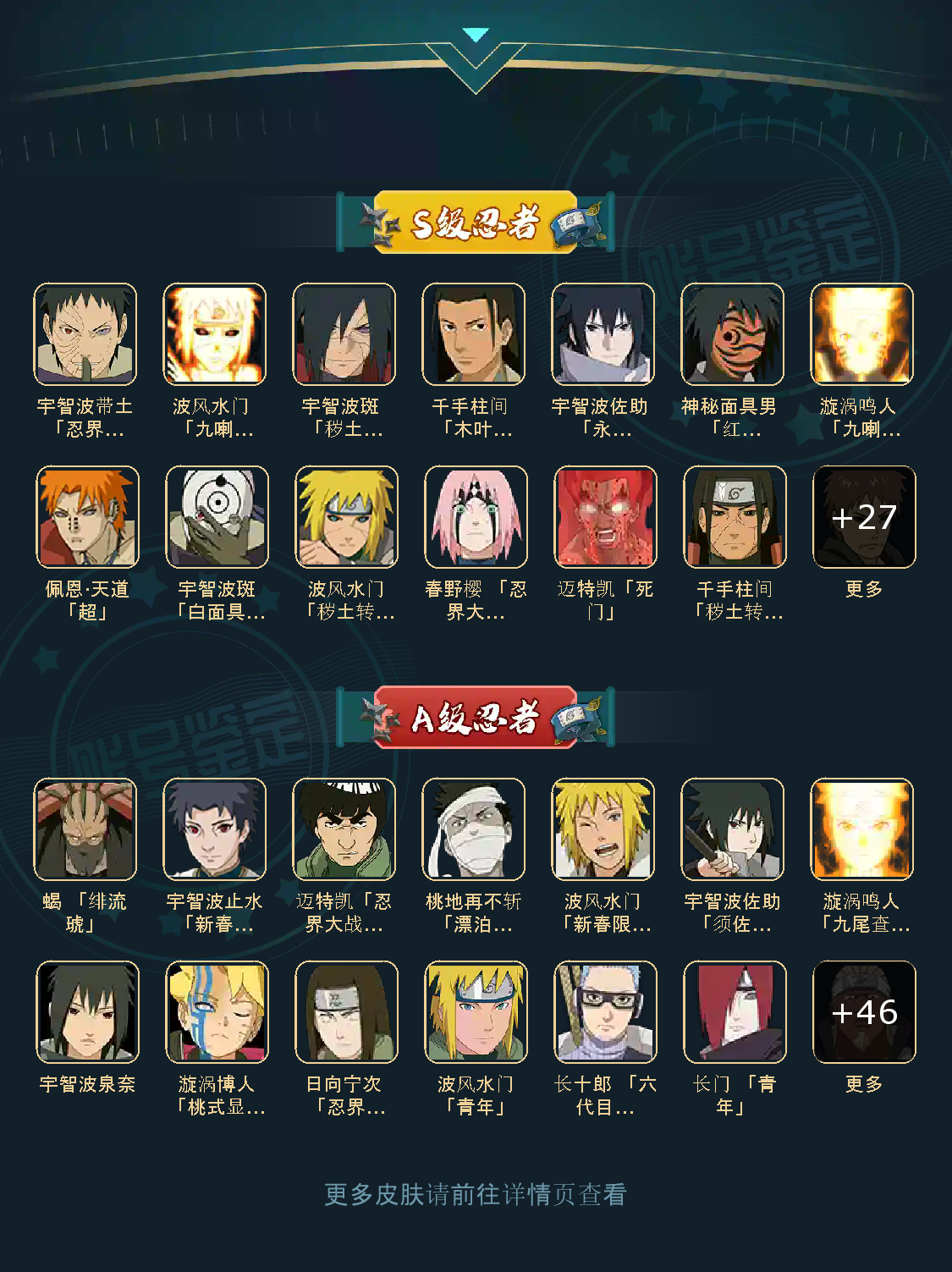 【38S忍者55A忍者1872W战力-12高招券】纲手 日斩 大蛇丸 水门 九喇嘛鸣人 永恒佐助 自来也 仙人自来也 舞杰自来也 百豪纲手 s门凯 秽土水门 秽土日斩 秽土扉间