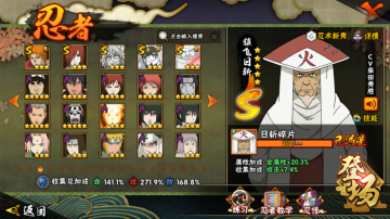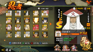 A级忍者(52个):宇智波,飞段「死司凭血」,角都,飞段,我爱罗「疾风传」,猿飞阿斯玛「秽土转生」,波风水门「新春限定」,迪达拉,桃地再不斩,蝎,迈特凯,猿飞阿斯玛,干杮鬼鲛,宇智波止水,小南,旗木卡卡西「万花筒写轮眼」,角都「地怨處」,漩涡鸣人「仙人模式」,奇拉比,志村团藏,宇智波佐助「万花筒写轮眼」,猿飞日斩「火影继承人」,照美冥「五代目水影」,勘九郎「忍界大战」,春野樱「百豪」,大蛇丸「晓」,秋道丁次「忍界大战」,小南「夏日泳装」,我爱罗「忍界大战」,地陆,宇智波「新春限定」,药师兜「半蛇斗篷」,千代「近松十人卫」,角都「晓创生」,漩涡鸣人「九尾査克拉」,猿飞木叶丸「博人传」,迪达拉「秽土转生」,桃地再不斩「漂泊武士」,加藤断,宇智波佐助「须佐能乎」,黑土「博人传」,奇拉比「忍界大战」,波风水门「青年」,不风,达鲁伊「博人传」,艾「青年」,长门「青年」,长十郎 「六代目水影」,不缘,日向宁次「忍界大战」,漩涡博人「桃式显现」,旗木卡卡西 「幻之喜容」
