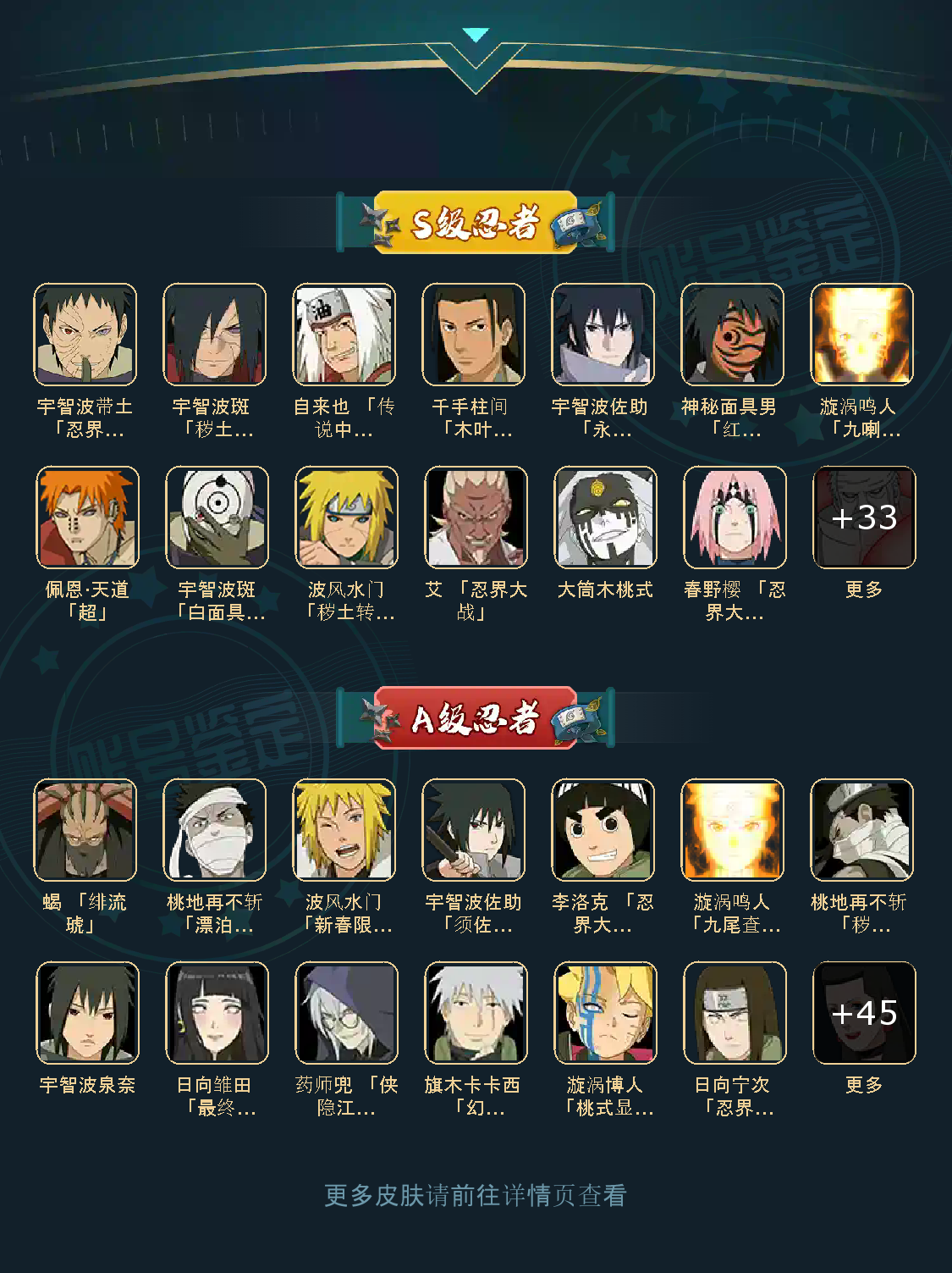 S级忍者(45个):猿飞日斩,自来也「仙人模式」,大野木「三代目土影」,宇智波鼬「须佐能乎」,自来也,纲手,波风水门,大蛇丸,佩恩「天道」,鬼灯幻月「二代目水影」,神秘面具男,千手扉间,艾「四代目雷影」,千手柱间,宇智波斑,长门「秽土转生」,猿飞日斩「秽土转生」,金角·银角「秽土转生」,波风水门「秽土转生」,无「二代日土影」,纲手「百豪」,千手扉间「秽土转生」,半藏「秽土转生」,宇智波斑「白面具」,艾「三代目雷影」,宇智波斑秽土转生」,药师兜「仙人模式」,佩恩·天道「超」,自来也「舞之豪杰」,宇智波鼬「秽土转生」,罗砂「四代目风影」,千手柱间「秽土转生」,宇智波带土「忍界大战」,宇智波斑「木叶创立」,迈特凯「死门」,大野木「忍界大战」,漩涡鸣人 「九喇连结」,大筒木金式 「博人传」,春野樱 「忍界大战」,神秘面具男「红夜之刃」,宇智波佐助 「永恒万花筒」,千手柱间 「木叶创立」,宇智波斑 「秽土转生·解」,大筒木桃式,艾 「忍界大战」