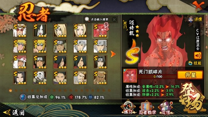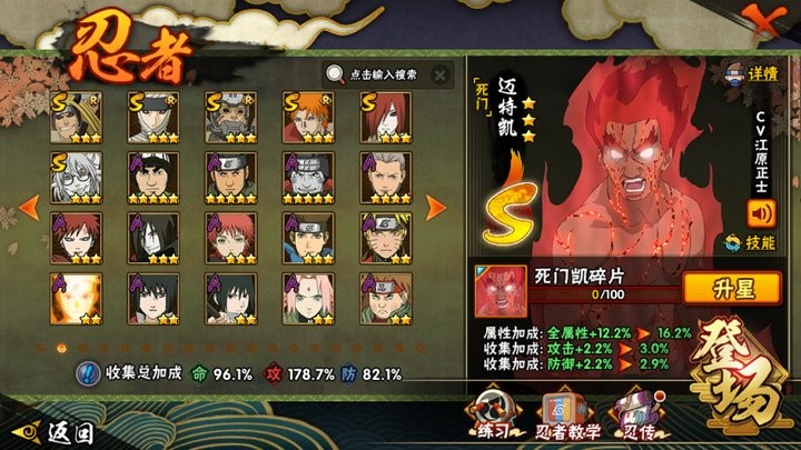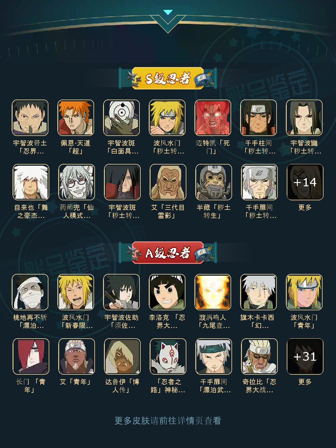 战力:1097W+;VIP11级;S忍26个;A忍38个,通灵兽17个,S忍:豪杰自来也大蛇丸百豪纲手普通纲手死门凯波风水门秽土水门秽土猿飞秽土扉间千手扉间千手柱间秽土柱间秽土斑宇智波斑须佐鼬秽土鼬白面具忍战带土鬼灯幻月三代艾金角银角秽土半