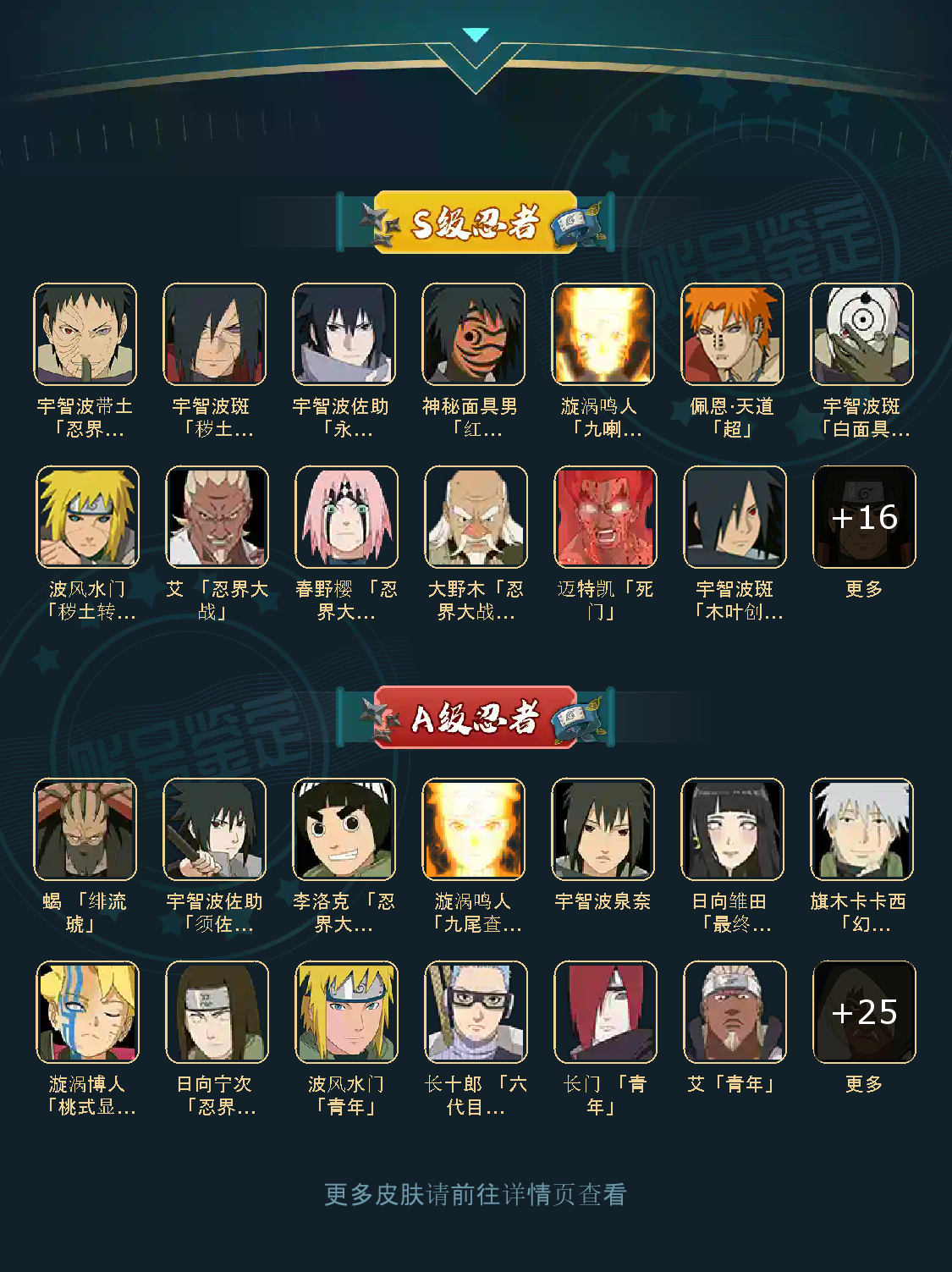 战力:865W+;VIP10级;S忍26个;A忍33个,通灵兽17个,S忍:九喇嘛鸣人永恒万花筒佐助忍战樱普通自来也豪杰自来也大蛇丸死门凯波风水门秽土水门秽土猿飞秽土扉间千手扉间秽土柱间秽土斑木叶创立斑秽土解斑秽土鼬神秘面具男白面具忍战带土