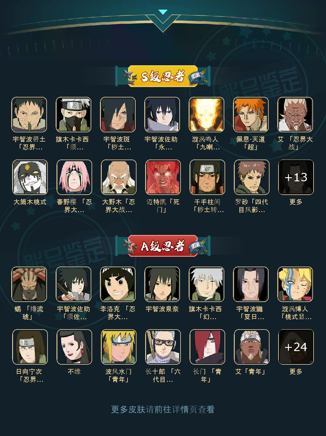 战力:1547W+;VIP10级;S忍22个;A忍29个,通灵兽19个,S忍:普通纲手猿飞日斩九喇嘛鸣人永恒万花筒佐助忍战樱仙人自来也大蛇丸死门凯普通自来也豪杰自来也波风水门秽土猿飞秽土柱间秽土斑秽土解斑秽土鼬忍战带土罗砂忍战大野木天道超仙
