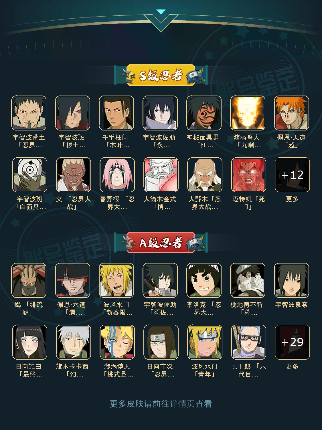 战力:1068W+;VIP11级;S忍22个;A忍35个,通灵兽18个,S忍:九喇嘛鸣人永恒万花筒佐助忍战樱豪杰自来也大蛇丸普通纲手死门凯波风水门秽土猿飞猿飞日斩秽土扉间秽土柱间木叶创立柱间秽土斑木叶创立斑秽土解斑白面具忍战带土红夜面具男忍