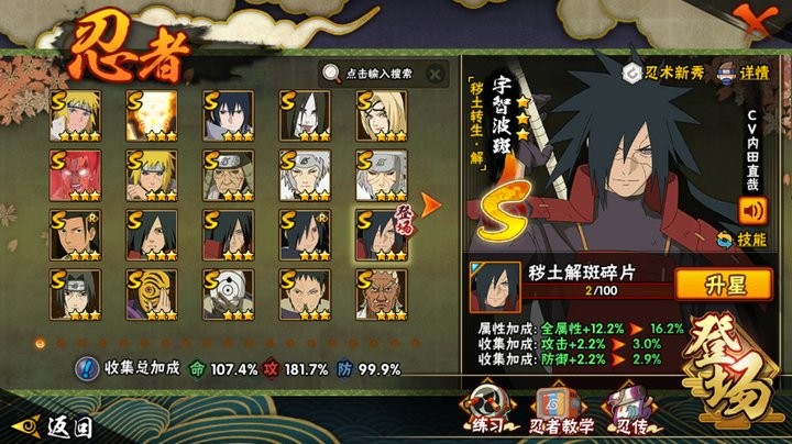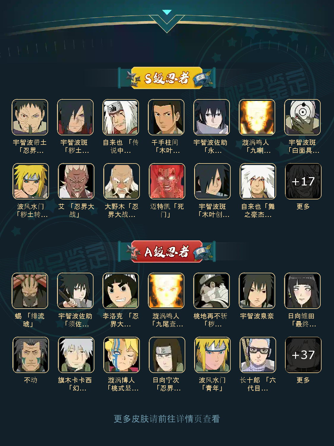 战力:1241W+;VIP13级;S忍27个;A忍43个,通灵兽18个,S忍:波风水门九喇嘛鸣人永恒万花筒佐助大蛇丸百豪纲手死门凯秽土水门秽土猿飞千手扉间秽土扉间木叶创立柱间秽土斑宇智波斑木叶创立斑秽土解斑须佐鼬神秘面具男白面具忍战带土四代