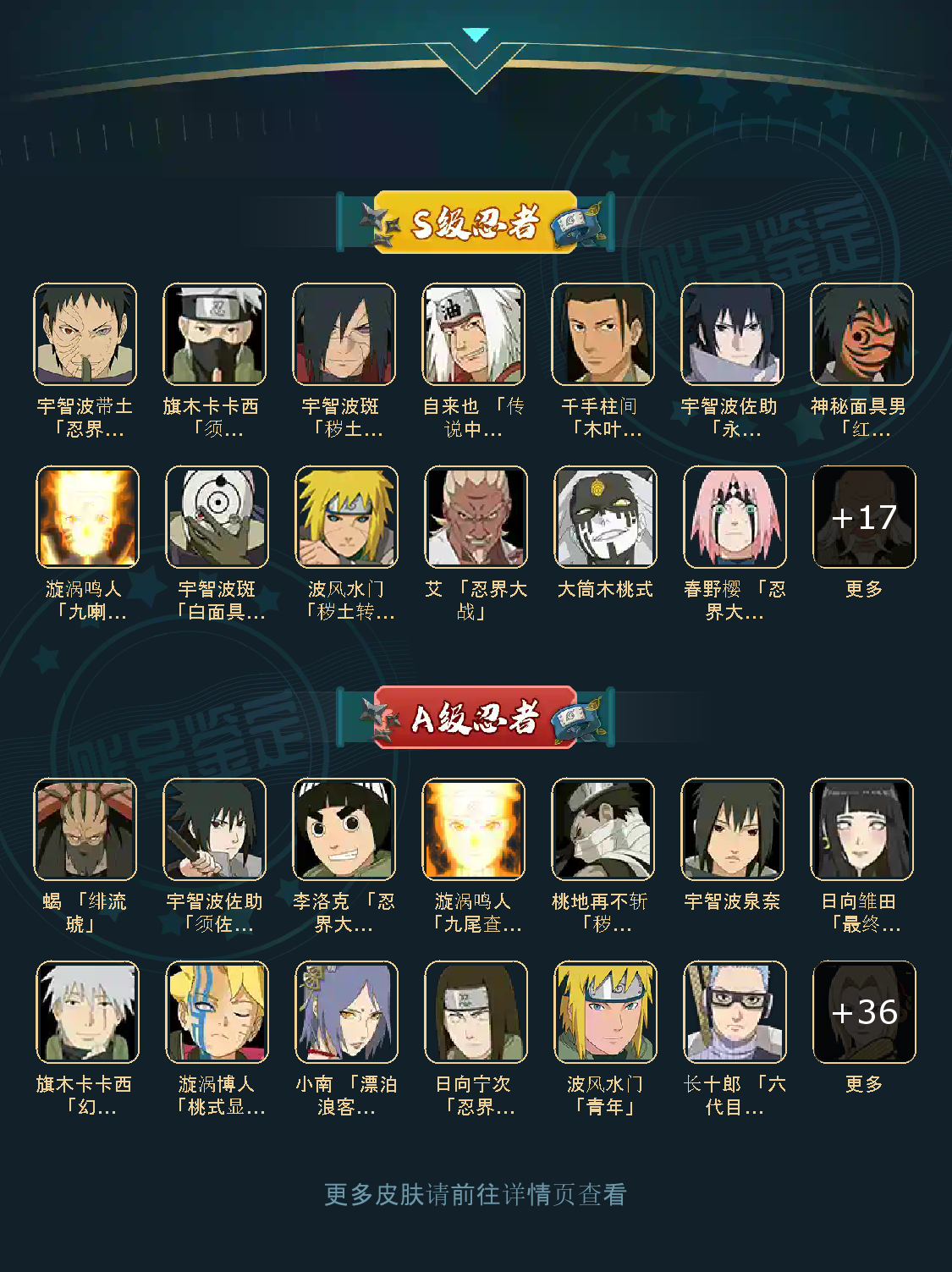 战力:1268W+;VIP11级;S忍27个;A忍42个,通灵兽18个,S忍:九喇嘛鸣人永恒万花筒佐助忍战樱普通自来也豪杰自来也大蛇丸普通纲手百豪纲手波风水门秽土水门秽土猿飞秽土柱间木叶创立柱间秽土斑秽土解斑秽土鼬白面具忍战带土红夜面具男三