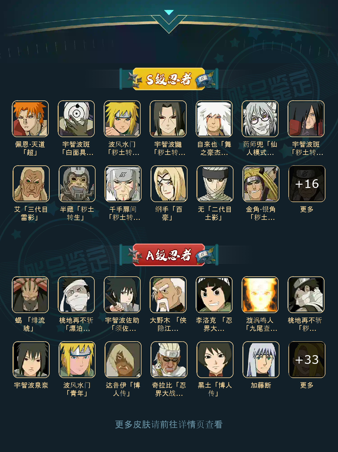 战力:1416W+;VIP12级;S忍29个;A忍37个,通灵兽20个,S忍:普通自来也普通纲手猿飞日斩千手扉间仙人自来也大蛇丸百豪纲手波风水门秽土水门豪杰自来也秽土猿飞秽土扉间千手柱间宇智波斑秽土斑须佐鼬秽土鼬神秘面具男白面具鬼灯幻月四代