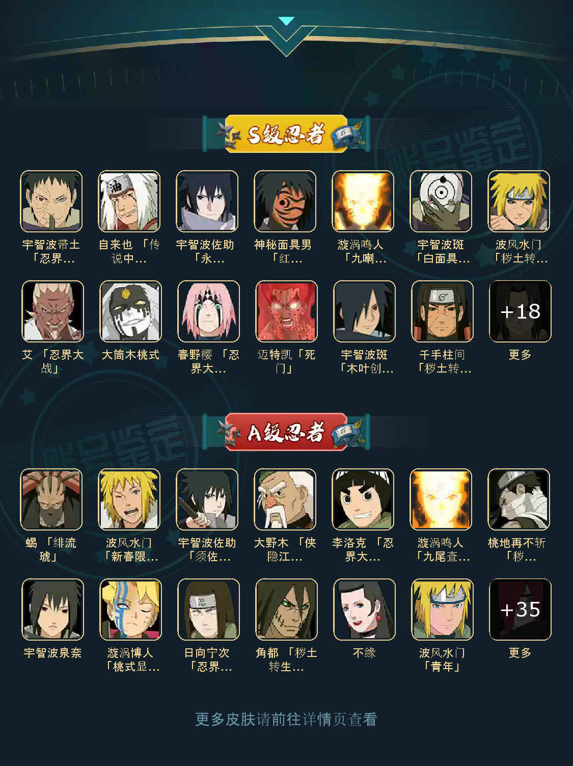 ;VIP11级;S忍30个;A忍40个,通灵兽22个,S忍:波风水门大蛇丸普通纲手九喇嘛鸣人永恒万花筒佐助忍战樱死门凯秽土水门普通自来也豪杰自来也猿飞日斩秽土猿飞千手扉间秽土扉间千手柱间秽土柱间秽土斑宇智波斑木叶创立斑须佐
