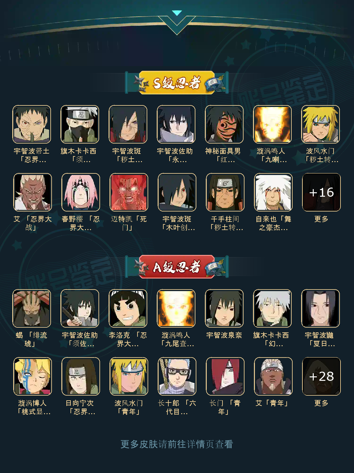 战力:1636W+;VIP9级;S忍26个;A忍34个,通灵兽21个,S忍:普通纲手波风水门猿飞日斩九喇嘛鸣人永恒万花筒佐助忍战樱仙人自来也大蛇丸普通自来也豪杰自来也百豪纲手死门凯秽土水门秽土猿飞秽土扉间秽土柱间秽土斑宇智波斑木叶创立斑秽土