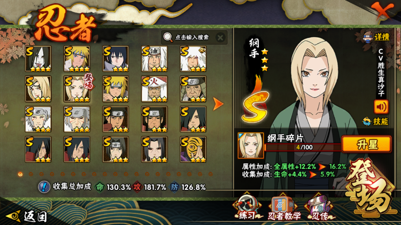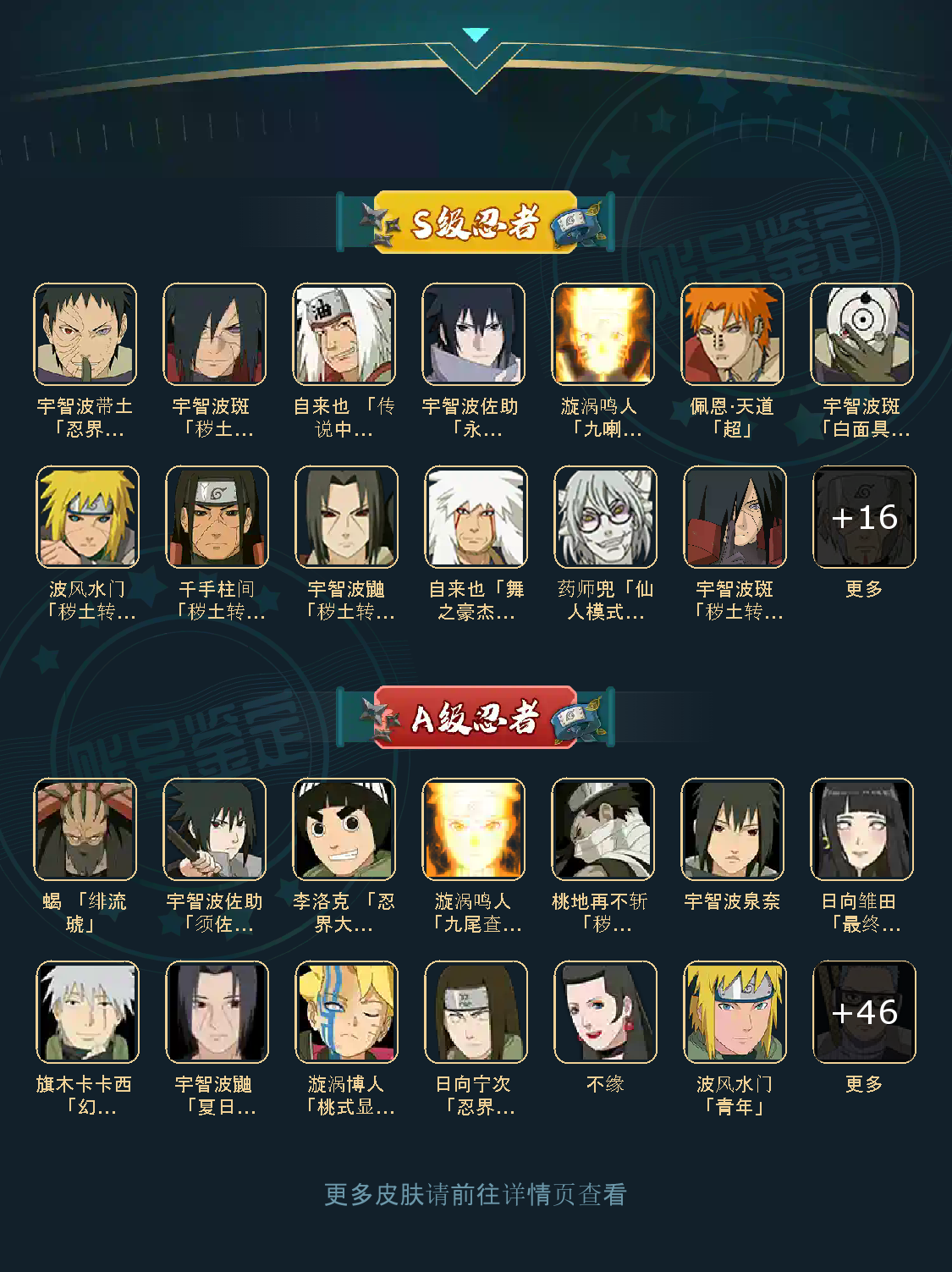 战力:1419W+;VIP11级;S忍27个;A忍52个,通灵兽21个,S忍:大蛇丸波风水门永恒万花筒佐助普通自来也豪杰自来也百豪纲手普通纲手秽土水门秽土猿飞猿飞日斩秽土扉间千手扉间千手柱间秽土柱间宇智波斑秽土斑秽土解斑须佐鼬秽土鼬神秘面具