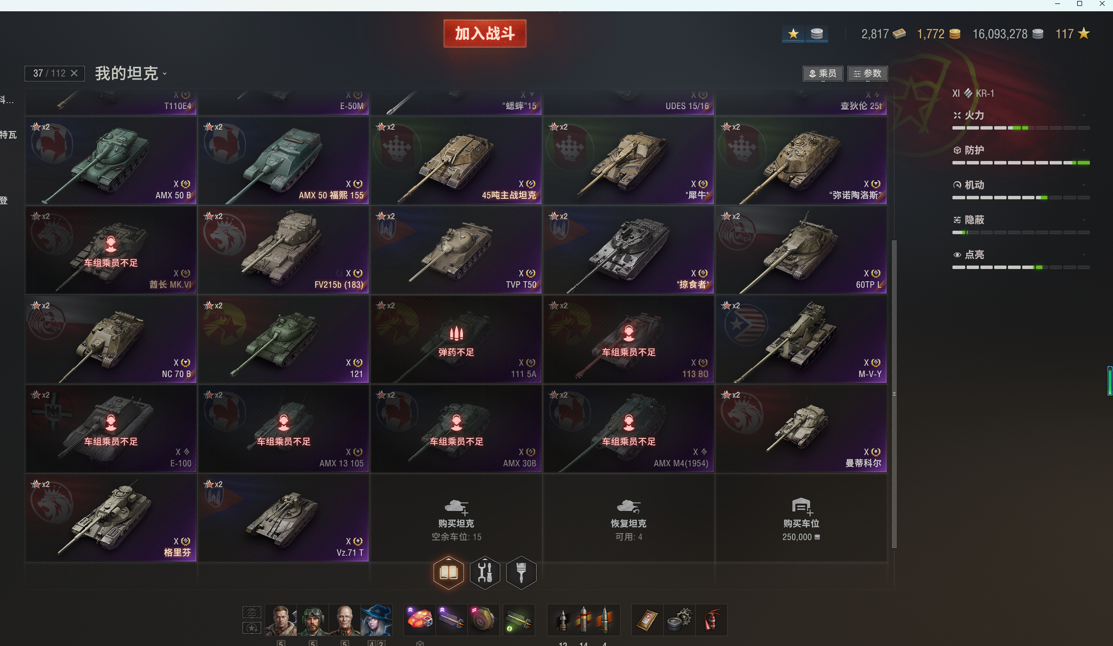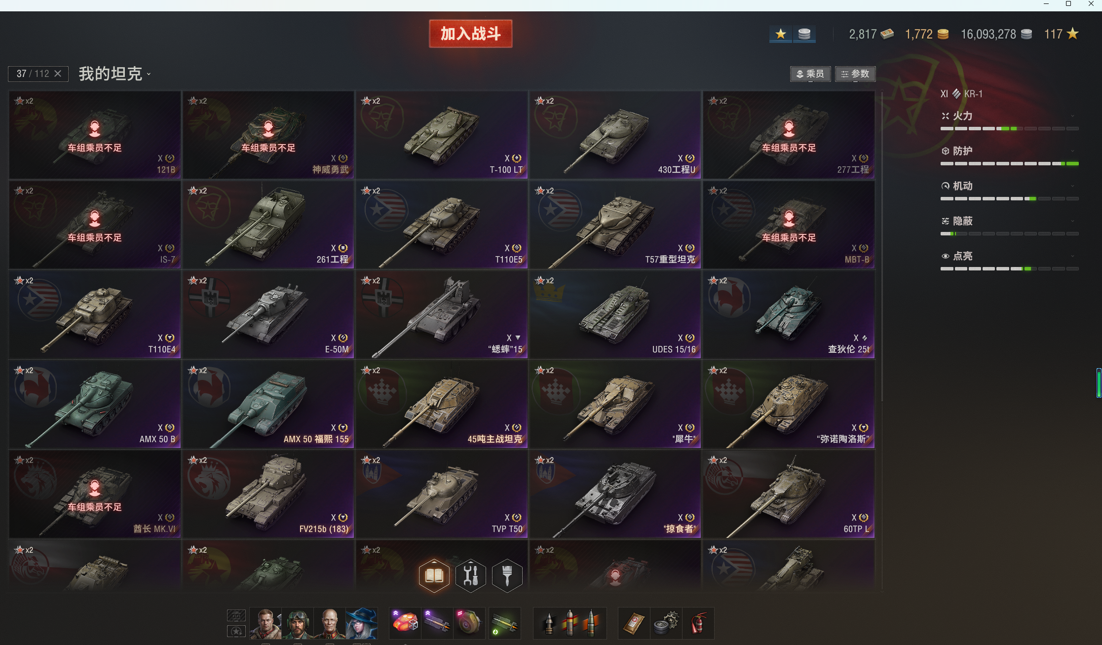 注意事项:1,进入游戏后,如果车辆情况不符。那是因为前面的玩家筛选了自己玩的坦克,其他的隐藏了。坦克显示栏,左下角小坦克标志,点进去把所有系别和级别选上,坦克就全部出来了。