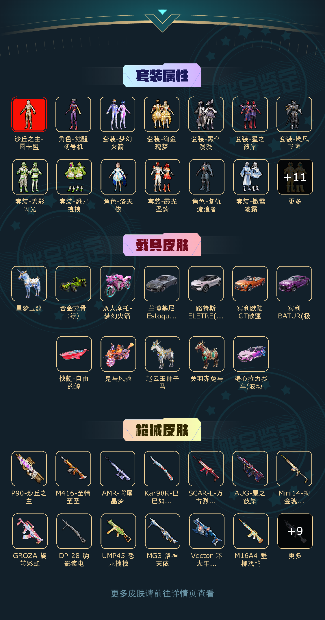23粉,12载具,150套装,M417-第五大道/SCAR-L-梦幻火箭/M416-风花雪月/AUG-星之彼岸/M249-彩虹甜喵/GROZA-旋转彩虹/AMR-鸢尾晶梦/P90-能量风暴/M16A4-垂柳戏鸭/Mini14-绚金瑰梦/Kar98K-未来歌姬/DP-28-圣堂之誓/MG3-洛神天依/Vector-环太平洋/M416-墨龙九天/M416-至情至圣/AKM-星际浪客/UMP45-恐龙拽拽/SCAR-L-万古烈焰/P90-沙丘之主/快艇-自由的鲸/双人摩托-梦幻火箭/宾利欧陆GT敞篷(火焰橘)/糖心拉力赛车(波动紫)/星梦玉骢/兰博基尼Estoque(银翼灰)/宾利BATUR(极速紫)/关羽赤兔马/合金龙骨(绿)/赵云玉狮子马/路特斯ELETRE(花绽灰)/鬼马风驰/