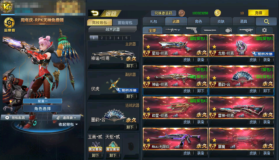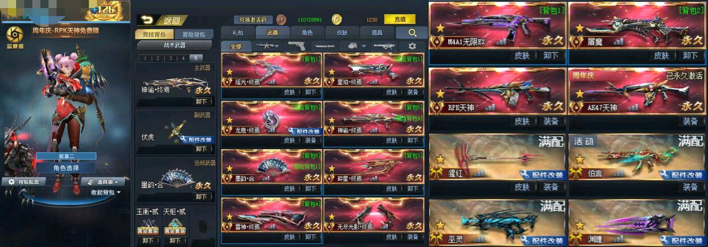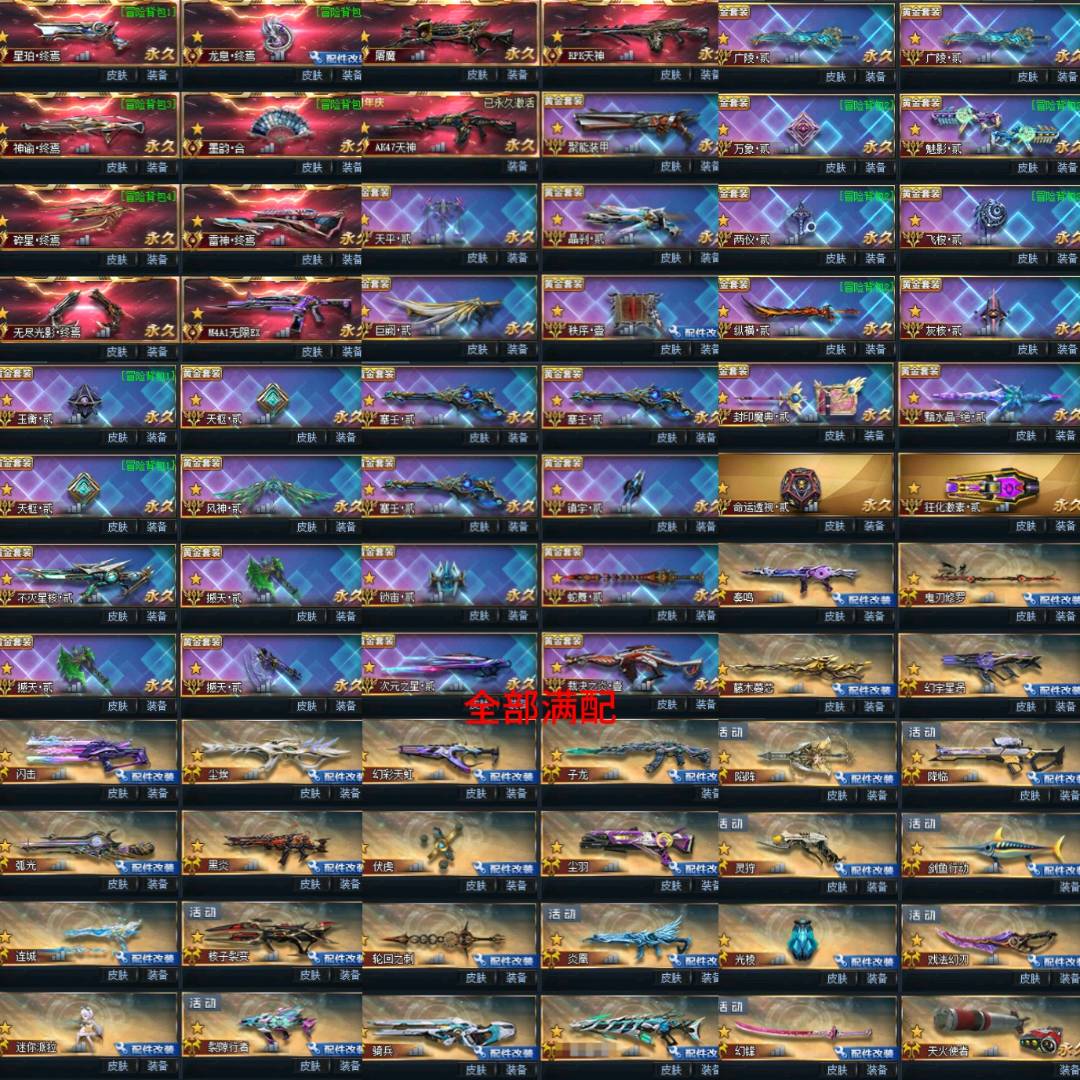 传说武器:龙息·终焉◆神谕·终焉◆AK47主宰◆墨韵·合◆碎星·终焉◆雷神·终焉◆SCAR-影魔◆无尽光影·终焉◆M4A1无限EX◆屠魔◆AK47天神◆