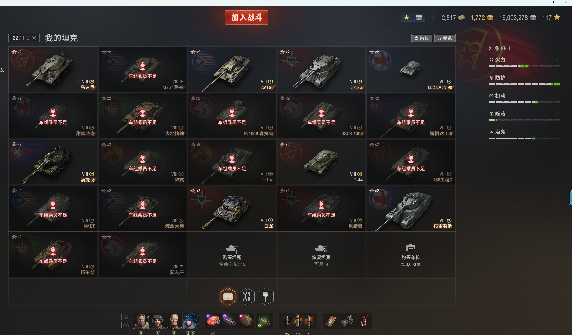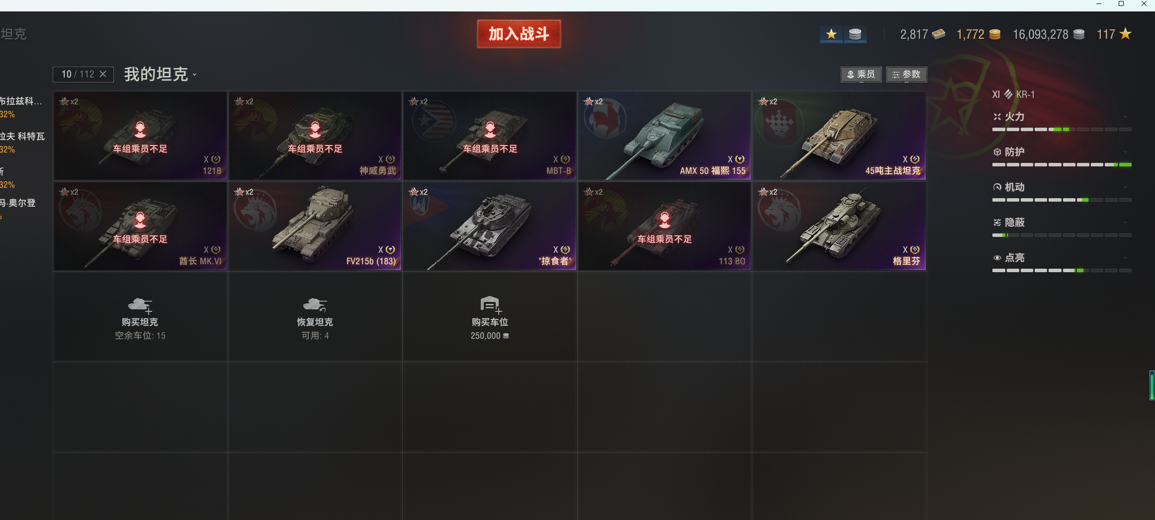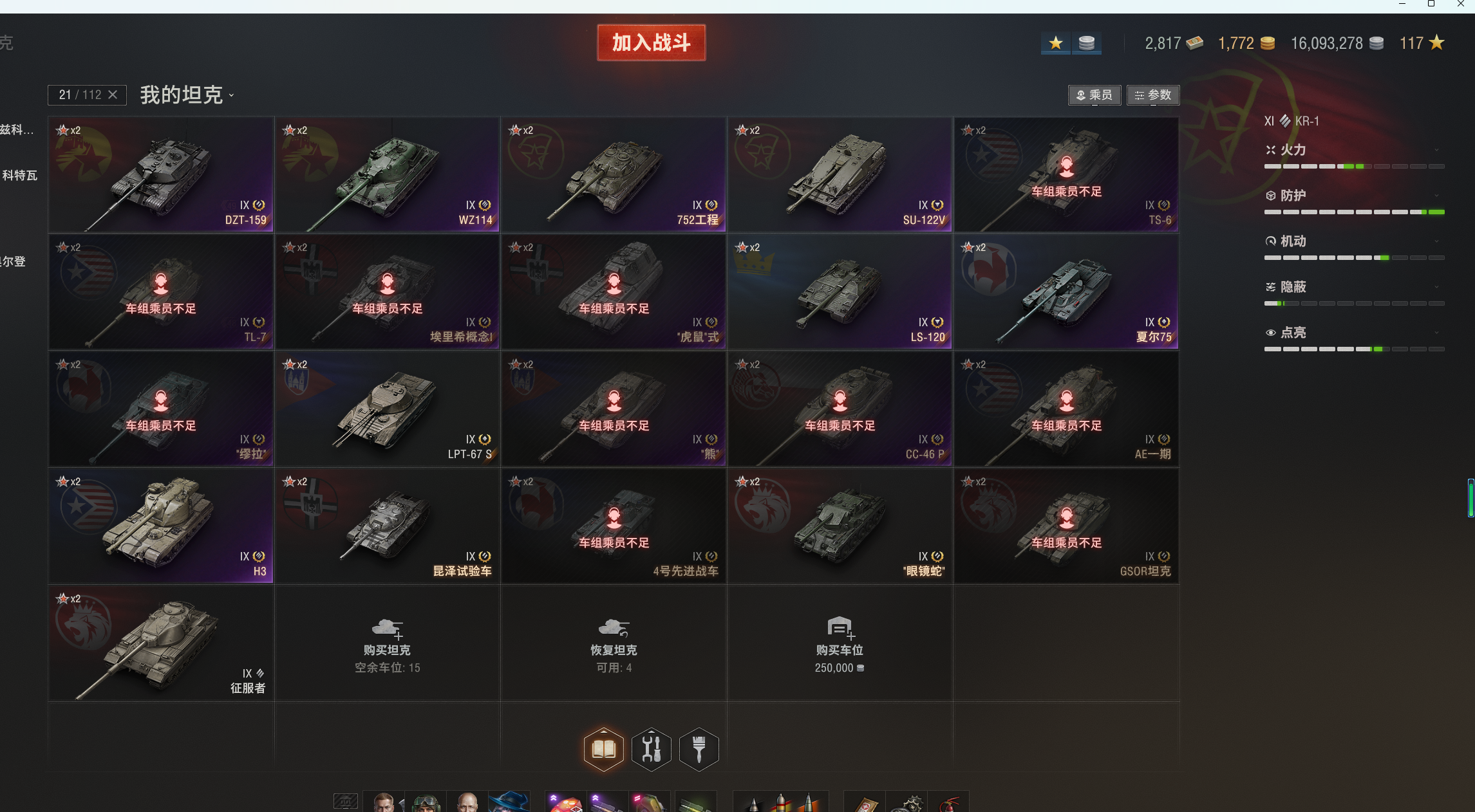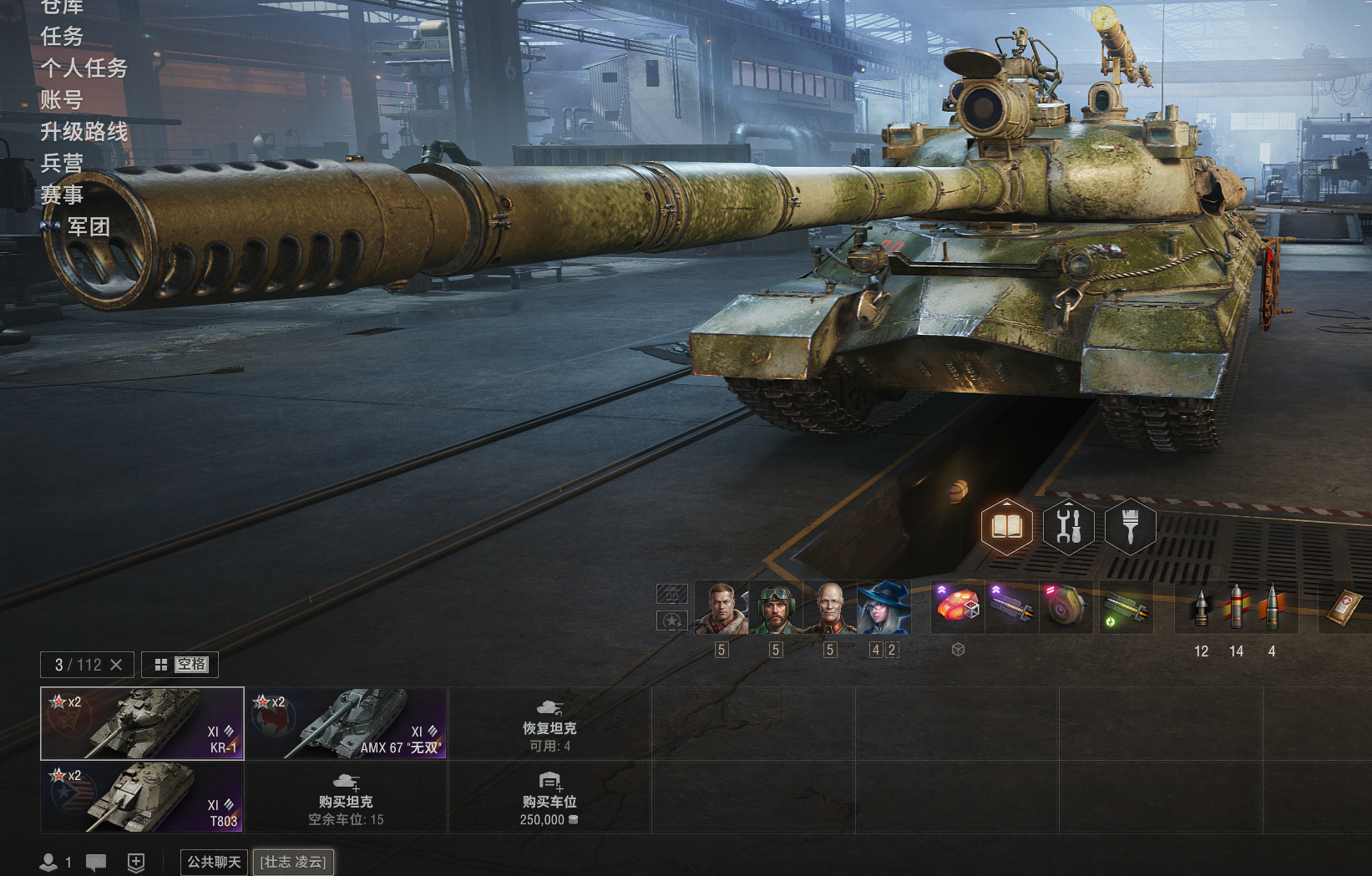 注意事项:1,进入游戏后,如果车辆情况不符。那是因为前面的玩家筛选了自己玩的坦克,其他的隐藏了。坦克显示栏,左下角小坦克标志,点进去把所有系别和级别选上,坦克就全部出来了。