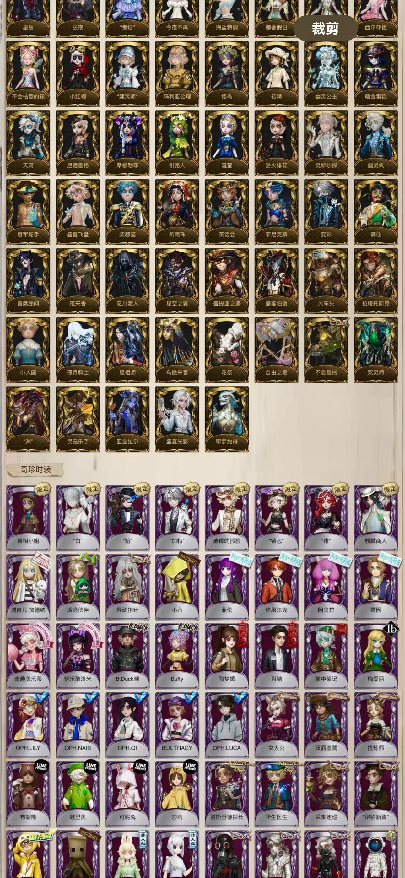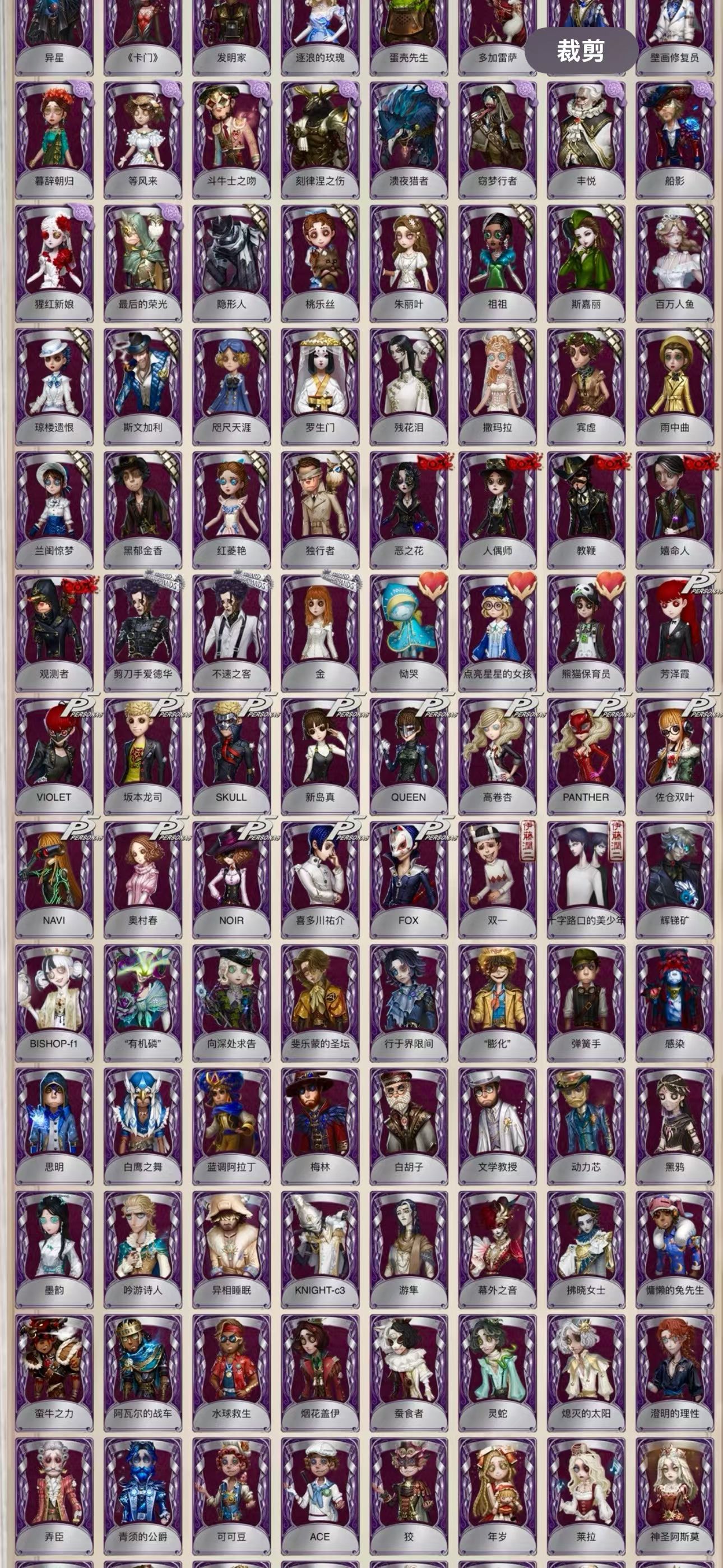 皮肤描述❤希望的残像/摩涅莫绪涅之梦/羊-恶之源/鸽子般的尤迪特/索菲亚/法罗金-猎物的印记/白泽/名誉首席/惊鸿/宇宙女巫/试运者/心锁/菖蒲/裁决之酒/十三娘/赤宴/静默之戟/艾维金-墨菲斯的门廊/白松露/川上富江/蚀日者/哲人石/典狱长/亡灵之主/哭丑金-欺惑之燕/蝰/初拥/珍奇柜/木偶金- KING-h1/温泉煮酒/日落黄沙/大副金-铁钩船长/蜡像金-怒火/邦邦金-三月兔/艾扎克/伊莎贝拉/文豪F4-太宰治-中原中也-芥川龙之介-中岛墩/JOKER/CROW/明智吾郎/日向创/赤松枫/永夜极光/异界行者/真想小姐/先知白/先知黯/祭祀绯/麒麟商人/瑞吉儿/猩红新娘/弹丸联动/柯南联动/p5满配❤