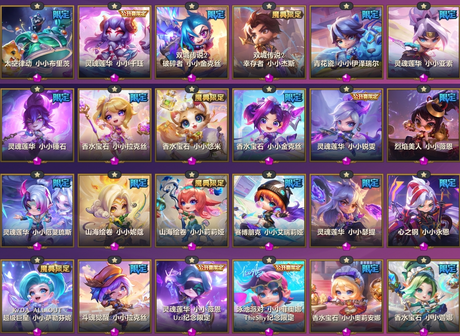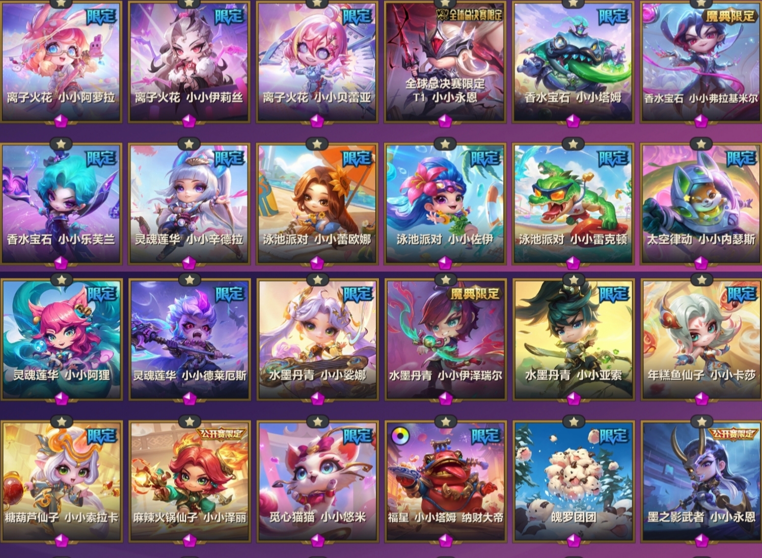 离子火花小小阿萝拉/离子火花小小贝蕾亚/离子火花小小伊莉斯/墨之影武者小小永恩/魄罗团团/太空律动小小布里茨/太空律动小小内瑟斯/全球总决赛限定t1小小永恩/青蛇小小萨勒芬妮/水墨丹青小小亚索/水墨丹青小小娑娜/水墨丹青小小伊泽瑞尔/香水宝石小小奥莉安娜/香水宝石小小迦娜/香水宝石小小瑞雯/香水宝石小小乐芙兰/香水宝石小小塔姆/香水宝石小小拉克丝/香水宝石小小悠米/灵魂莲华小小阿狸/神王小小盖伦/灵魂莲华小小辛德拉/KDA超级巨星小小萨勒芬妮/幸存者小小杰斯/灵魂莲华小小千珏/灵魂莲华小小瑞雯/灵魂莲华小小厄斐琉斯/灵魂莲华小小锤石/灵魂莲华小小德莱厄斯/电玩女神小小凯特琳/泳池派对小小佐伊/泳池派对小小雷克顿/泳池派对小小菲奥娜/泳池派对小小蕾欧娜/年糕鱼仙子小小卡莎/觅心猫猫小小悠米/双城传说2破碎者小小金克丝/山海绘卷小小妮蔻/斗魂觉醒小小拉克丝/剪纸仙灵小小格温/灵魂莲华小小永恩/灵魂莲华小小薇恩/灵魂莲华小小瑟提/电玩女神小小娑娜/星之守护者小小拉克丝/赛博朋克小小艾瑞莉娅/青花瓷小小伊泽瑞尔/香水宝石小小金克丝/绝版奶茶河灵等等