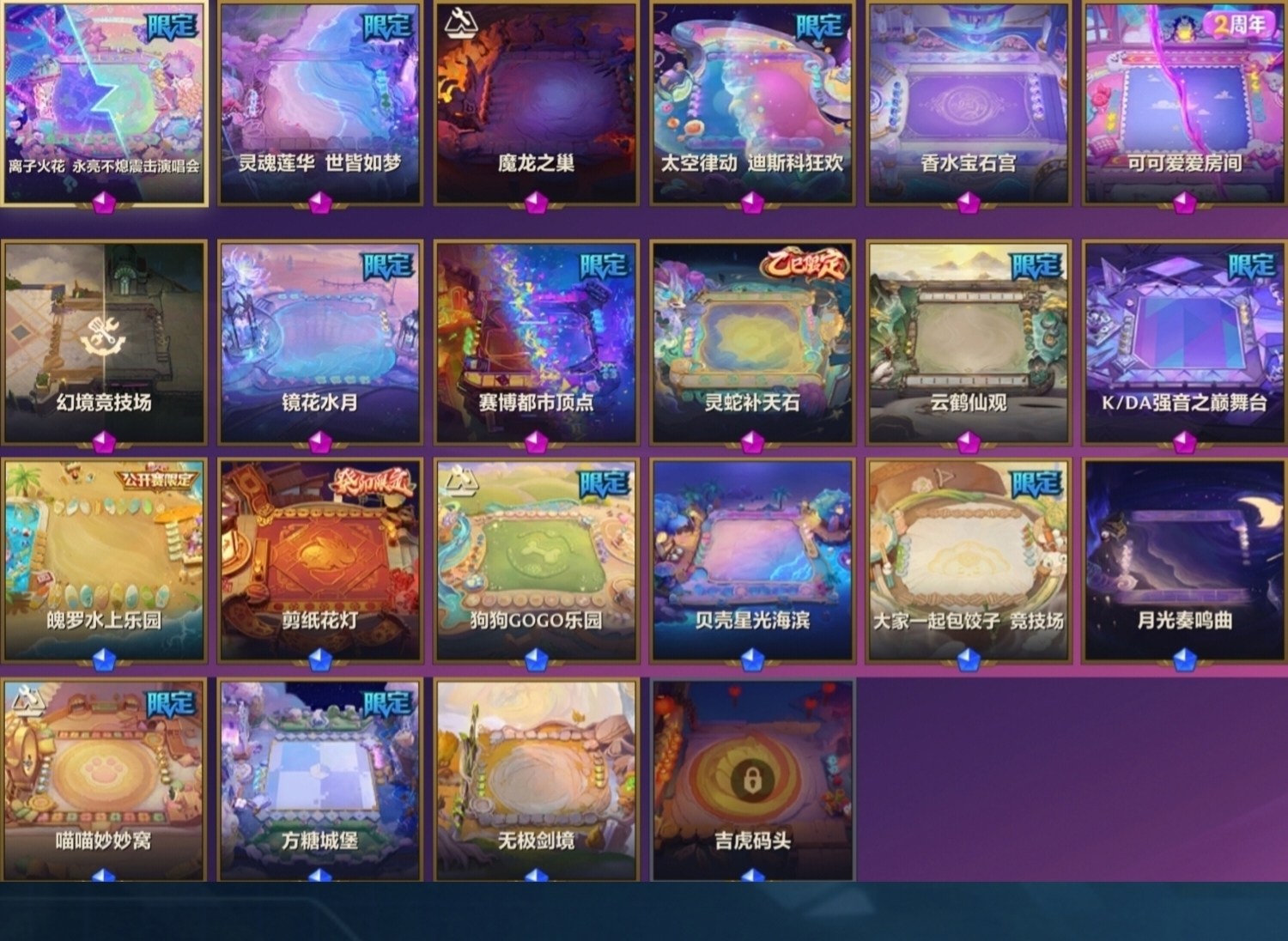 竞技场:离子火花永亮不熄震击演唱会/镜花水月/云鹤仙观/太空律动迪斯科狂欢/灵魂莲华世皆如梦/赛博都市顶点/魔龙之巢/可可爱爱房间/香水宝石宫/灵蛇补天石/狗狗GOGO乐园全收集/喵喵妙妙屋全收集/月光奏鸣曲/魄罗水上乐园/贝壳星光海滨/大家一起包饺子/剪纸花灯/方糖城堡/云海九天/雨过城楼/金克丝的卧室/元宵饭店/魔法瀑布/魄罗的滑雪乐园/竹林禅院/演武场/魄罗糖果岛等等