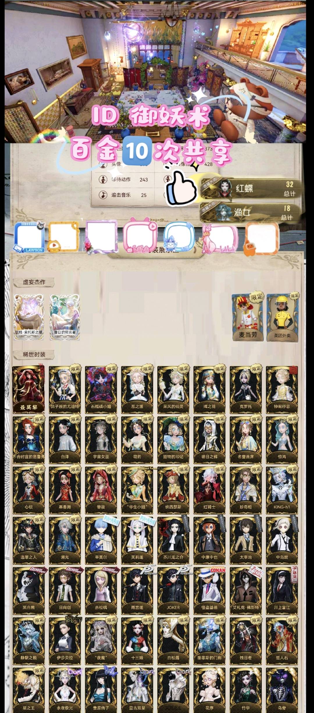 【安卓】 165金 十次共享❤️渔女 红蝶 祭祀 满配❤石榴蝶恶之源 白泽⭐静默 十三娘 夜魔❤克罗托 蚀日