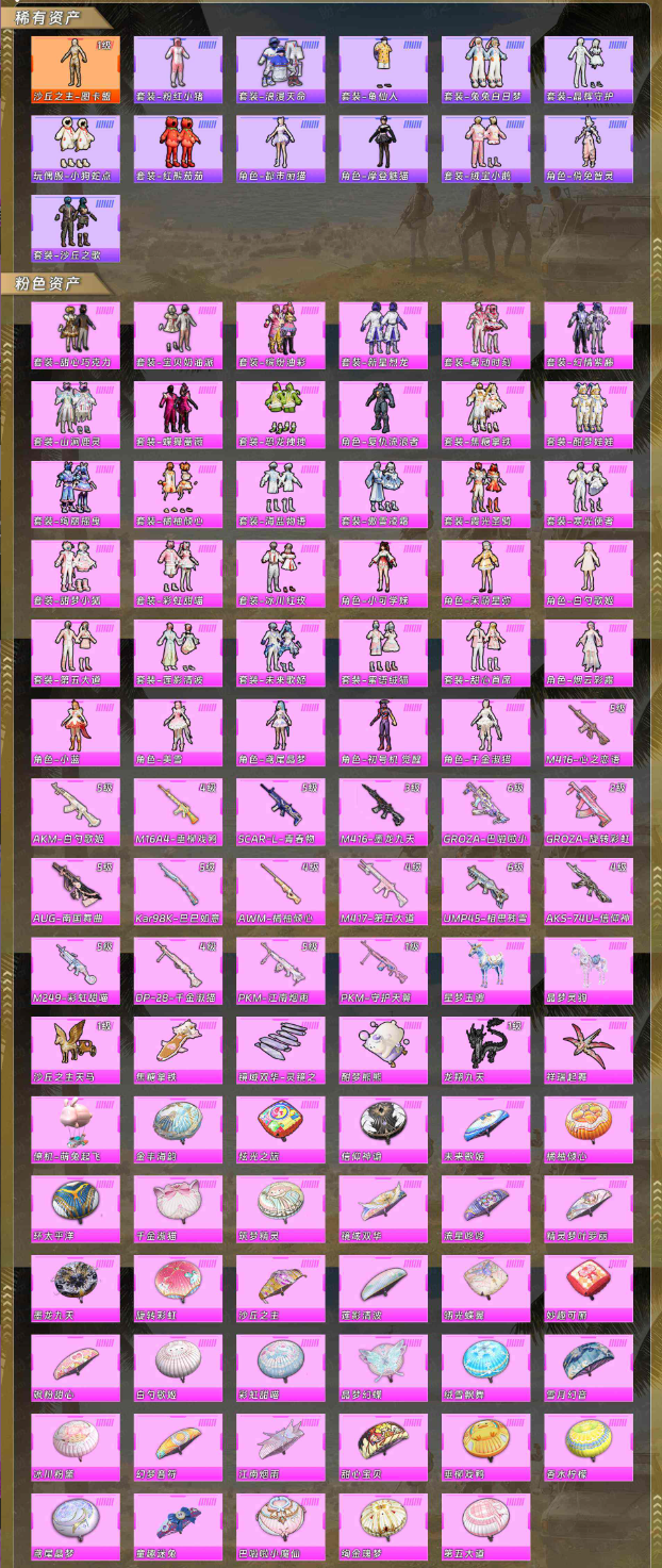 【粉色枪皮】M416-心之恋语/AKM-白勺歌姬/M16A4-垂柳戏鸭/SCAR-L-青春物语/M416-墨龙九天/GROZA-巴啦啦小魔仙/GROZA-旋转彩虹/AUG-南国舞曲/Kar98K-巳巳如意/AWM-橘柚倾心/M417-第五大道/UMP45-相思残雪/AKS-74U-信仰神谕/M249-彩虹甜喵/DP-28-千金淑猫/PKM-江南烟雨/PKM-守护天翼