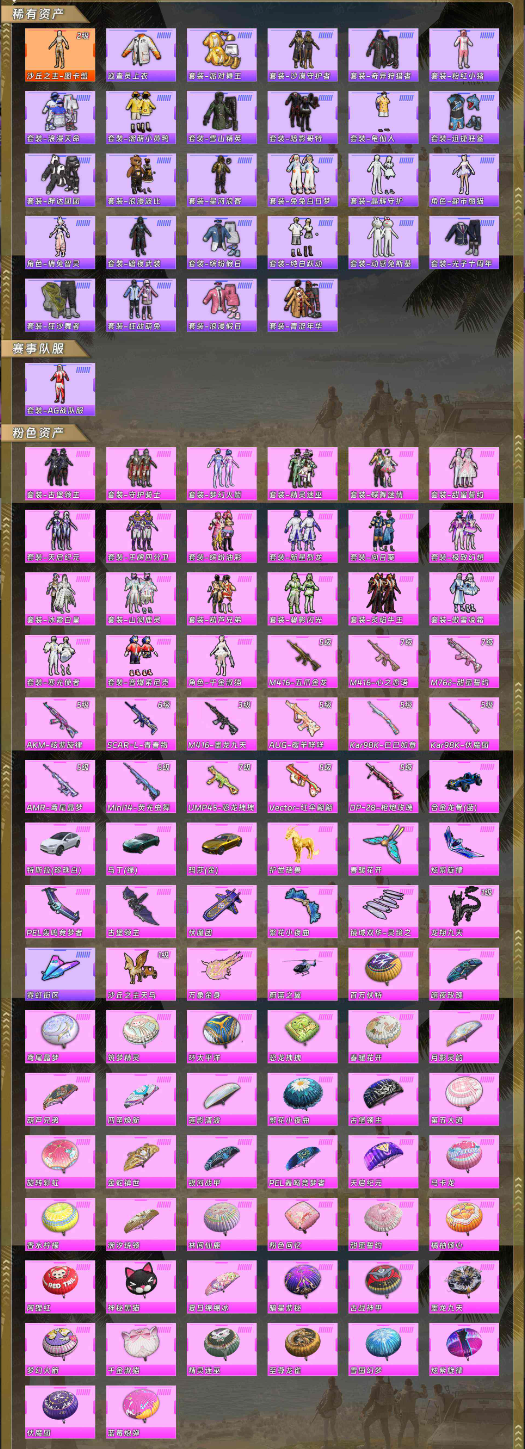 【粉色套装】套装-古堡领主/套装-守护骑士/套装-梦幻火箭/套装-精灵迷巫/套装-蝶舞迷情/套装-甜蜜誓约/套装-天启纪元/套装-王牌四分卫/套装-缤纷油彩/套装-新星烈龙/套装-向日葵/套装-极致幻想/套装-冰霜白皇/套装-山涧鹿灵/套装-葫芦兄弟/套装-碧影闪光/套装-炙焰牛王/套装-傲雪凌霜/套装-寒光使者/套装-音爆索尼克/角色-千金淑猫
