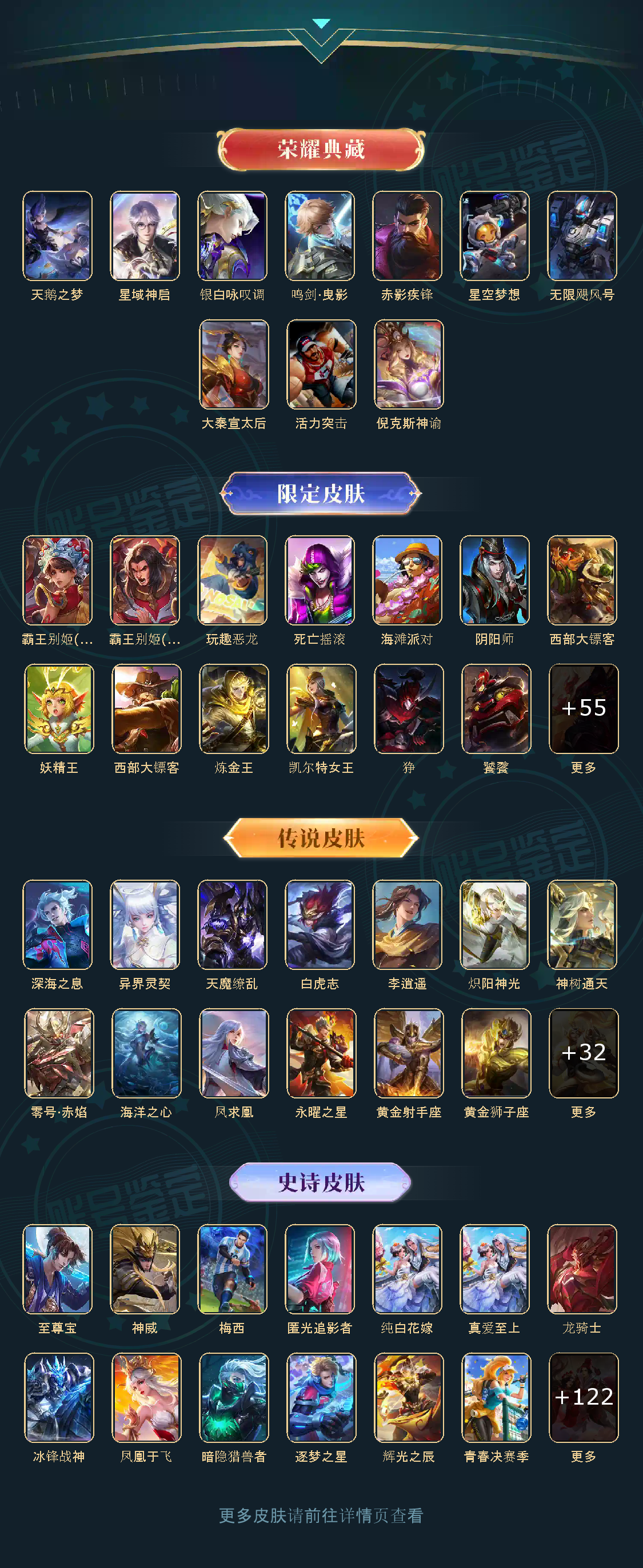 贵族等级V10,英雄数量124,典藏皮肤数9,皮肤数量417,天鹅之梦/星空梦想/无限飓风号/活力突击/倪克斯神谕/鸣剑·曳影