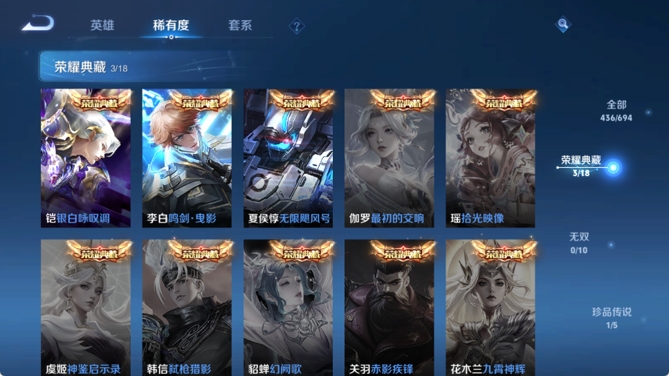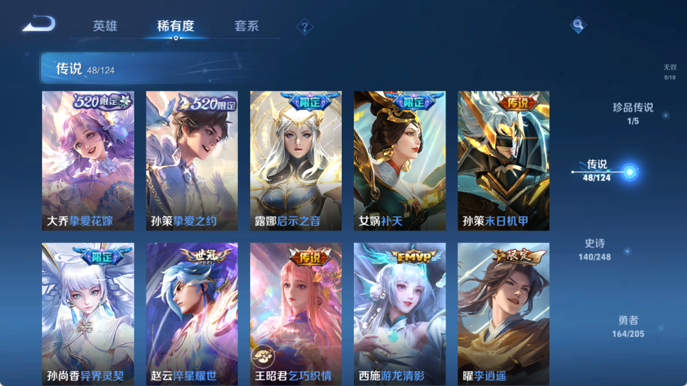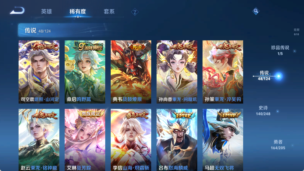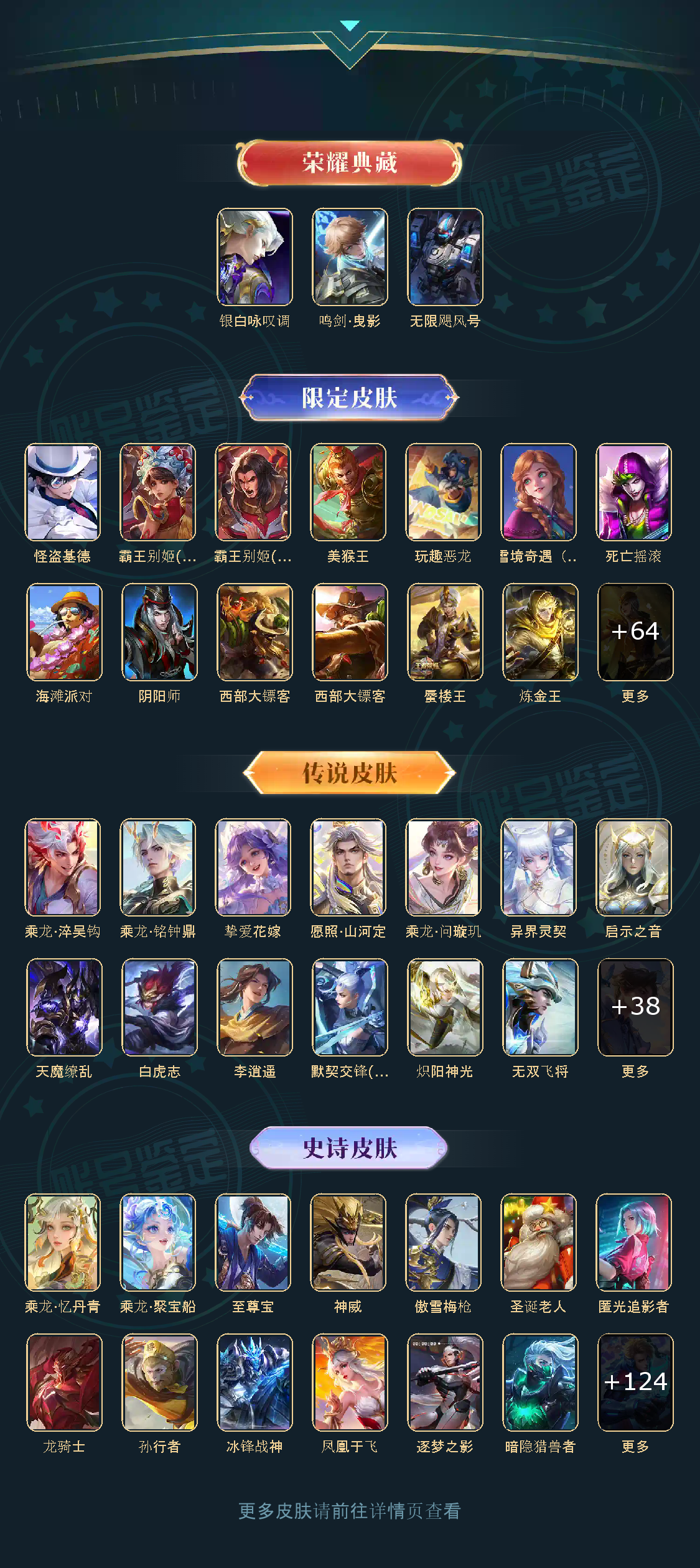 贵族等级V10,英雄数量124,典藏皮肤数3,皮肤数量437,冰锋战神/街头霸王/天魔缭乱/至尊宝/圣诞老人/王者之锤/凤求凰/逐梦之影/武陵仙君/无限飓风号/黄金狮子座/大圣娶亲/冰霜恋舞曲/青龙志/白虎志/久胜战神/飞衡/梁祝/匿光追影者/鸣剑·曳影/龙胆/李逍遥/孙行者/玉兔公主/补天/异界灵契/神威/启示之音/傲雪梅枪/淬星耀世/时雨天司