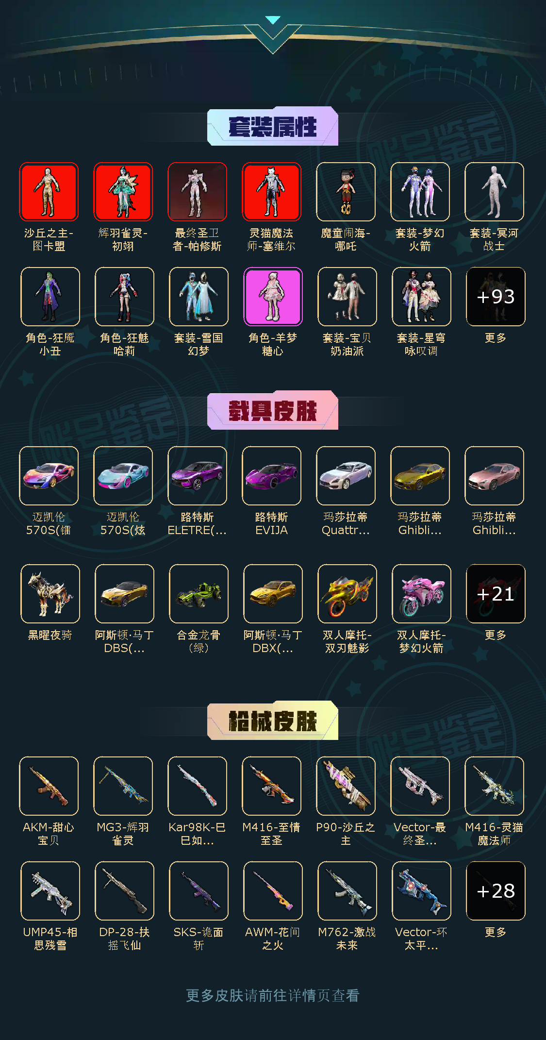 105粉,34载具,497套装,37王牌印记,超级王牌21星历史最高段,368849热力值 平底锅-仲夏莫吉托/平底锅-林间仙鹿/M416-灵猫魔法师/AKM-甜心宝贝/SCAR-L-梦幻火箭/SCAR-L-童趣迷兔/AUG-星之彼岸/M762-甜心娃娃/M762-激战未来/GROZA-香水柠檬/M416-暖熊萌萌/M416-心之恋语/M16A4-葫芦兄弟/M416-五爪金龙/M16A4-垂柳戏鸭/GROZA-焦糖拿铁/M416-至情至圣/M762-甜蜜誓约/SCAR-L-魔童闹海 哪吒/M417-第五大道/SKS-诡面斩/Mini14-荧光虫舞/MK20-H-海螺星光/DP-28-暗夜鎏金/DP-28-扶摇飞仙/MG3-辉羽雀灵/DP-28-枪炮玫瑰/MG3-洛神天依/DP-28-豹影疾电/汤姆逊-怪笑疯兔/Vector-环太平洋/Vector-最终圣卫者/UMP45-相思残雪/P90-沙丘之主/爆炸猎弓-雪梅暗香/Kar98K-伏魔团/AWM-花间之火/Kar98K-巳巳如意/Kar98K-未来歌姬/Kar98K-暗翼战神/M24-星之信仰/玛莎拉蒂Ghibli(金)/俏皮小熊猫/特斯拉Roadster(尊享铂)/特斯拉Roadster(沁心粉)/特斯拉Roadster(水滴蓝)/阿斯顿·马丁DBS(金)/玛莎拉蒂Quattroporte(幻星粉)/玛莎拉蒂Ghibli(粉)/萌喵橘座/路特斯ELETRE(电光紫)/阿斯顿·马丁DBX(金)/路特斯ELETRE(花绽灰)/鬼马风驰/快艇-自由的鲸/快艇-塞莎KL27(深潜蓝)/快艇-塞莎KL27(霓虹粉)/快艇-塞莎KL27(鲸之蓝)/特斯拉Cybertruck(镭光铂)/金龙耀世/灵鼠银迹/合金龙骨(绿)/兰博基尼Aventador(翡翠绿)/迈凯伦570S(炫冰蓝)/路特斯EVIJA(电光紫)/迈凯伦570S(镭射紫)/软萌羊咩咩/黑曜夜骑/辉羽雀灵自行车/双人摩托-梦幻火箭/双人摩托-双刃魅影(红)/双人摩托-双刃魅影(金)/极速兔兔/杜卡迪PanigaleV4(杜卡迪红)/踏焰逐风摩托车/