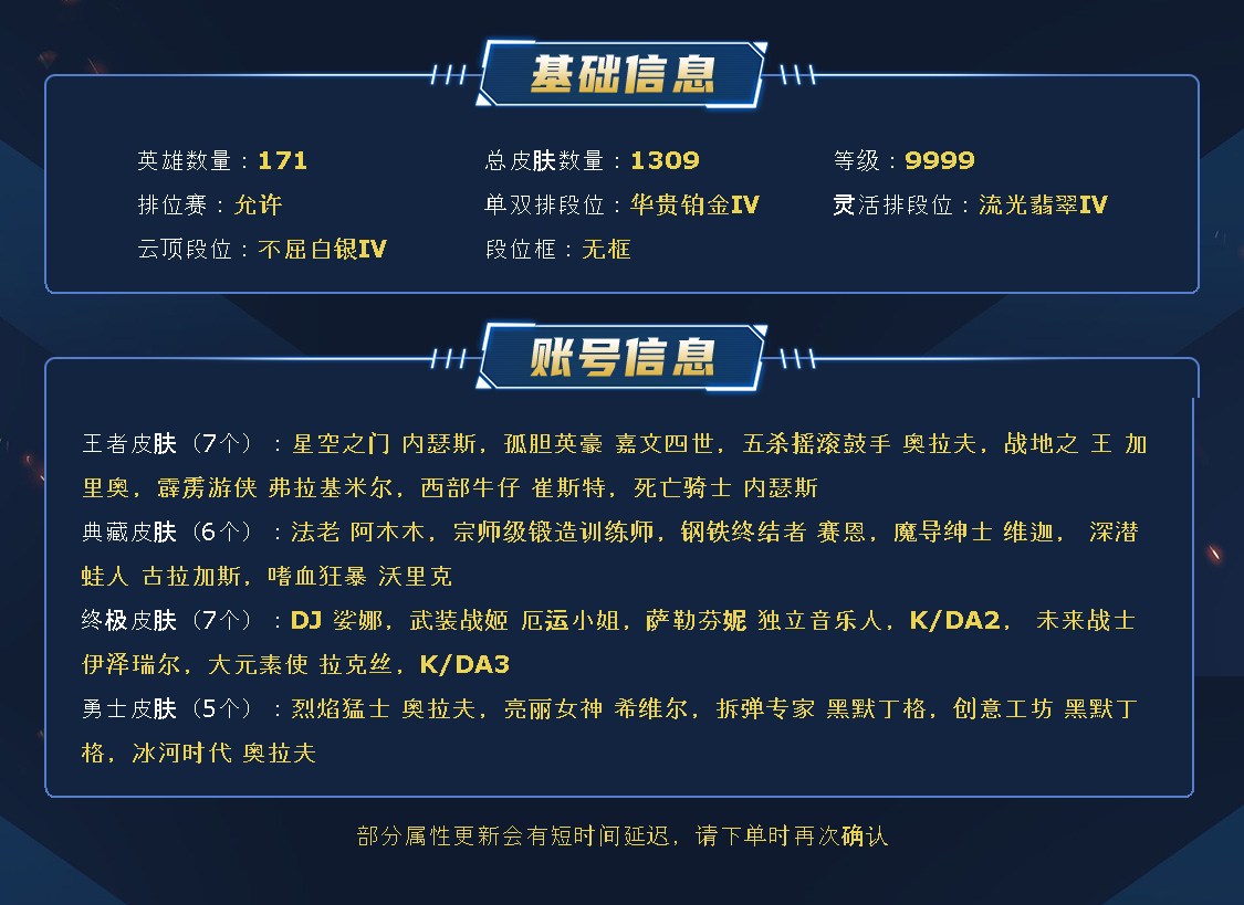 【重要皮肤】花仙使者卡特琳娜至臻 绝息圣堂厄运小姐至臻 女帝黛安娜至臻 战斗学院蕾欧娜至臻 魔女婕拉至臻 奥术师佐伊至臻 未来战士卢锡安至臻 真实伤害亚索至臻 真实伤害赛娜至臻 星之守护者索拉卡至臻 灵能特工伊泽瑞尔至臻 源计划逆流塞拉斯至臻 王国机神玄武盖伦至臻 神龙尊者炎龙瑟提至臻 黑夜使者凯隐至臻 神龙尊者均衡之龙沃利贝尔至臻 飞升战神潘森至臻 焰执事布兰德至臻 KDA二代卡莎至臻 KDA阿狸至臻 KDA阿卡丽至臻 战斗学院拉克丝至臻 烈焰美人薇恩至臻 电玩女神凯特琳至臻 魅惑女巫厄运小姐至臻 源计划正义艾瑞莉娅至臻 真实伤害奇亚娜至臻 绒毛菲兹至臻 腥红之月亚托克斯至臻 黑夜使者李青至臻 灰烬征服者潘森 海克斯科技安妮 海克斯科技瑟庄妮 海克斯科技克格莫 海克斯科技斯维因 海克斯科技吉格斯 海克斯科技波比 海克斯科技嘉文四世 海克斯科技魔腾 新卧虎藏龙贾克斯 暗星科加斯 黎明使者卡尔玛 恐惧新星德莱厄斯 零之枪骑赫卡里姆 摄魂使者薇恩 青年瑞兹 胜利剑圣易 胜利女神娑娜 胜利之王泰达米尔 胜利巨口克格莫 舞会公主安妮 战熊骑士瑟庄妮 创星之灵璐璐 钢铁军团拉克丝 养蜂人辛吉德 电玩勇者锐雯 电玩女神阿狸 玉剑传说无影 玉剑传说舞剑仙 银龙裁决泰隆 替父从军花木兰 神龙烈焰金克丝 碧玉之牙卡西奥佩娅 春晖神女拉克丝 北辰之威内瑟斯 南天之怒沃里克 美猴王孙悟空 玉净夜叉凯特琳 紫金罗刹莫甘娜 广寒仙子嫦娥 虎痴之拳蔚 张辽文远 司马懿仲达 金猪烈焰瑟庄妮 纳财大帝塔姆 神龙之翼库奇 王国机神青龙德莱文 王国机神朱雀蕾欧娜 王国机神苍狼瑟提 王国机神白虎贾克斯 王国机神玄武盖伦 福牛守护者厄斐琉斯 胜利枪神卢锡安 胜利之剑亚托克斯 甜心之羽霞 甜心之翎洛 甜心宝贝安妮 穿心之剑菲奥娜 觅心游侠卢锡安 觅心女王艾希 觅心之翼奎因 觅心萝莉金克丝 觅心猫猫悠米 寒冬精灵璐璐 雪球也能爆炸吉格斯 圣诞捣蛋鬼金克丝 圣诞老人布隆 圣诞老人德莱文 冰雪驯鹿波比 冰雪风暴希维尔 冬季仙境卡尔玛 持胡萝卜的雪人易 狂心冰王图奇 冰封王子蒙多 冰雪女神辛德拉 魄罗骑士瑟庄妮 平安夜女神娑娜 圣诞糖果棒厄运小姐 魅惑女巫崔丝塔娜 魅惑女巫奈德丽 死亡誓约卡特琳娜 泳池派对奥莉安娜 泳池派对塔莉垭 泳池派对厄运小姐 泳池派对塔里克 泳池派对菲奥娜 泳池派对格雷福斯 泳池派对蕾欧娜 泳池派对雷克顿 御星魔矢艾希 送披萨的小姐姐希维尔 鸡里奥 克格汪 制胜金靴李青 制胜金球拉莫斯 EDG厄斐琉斯 EDG佛耶戈 EDG格雷福斯 EDG悠米 EDG佐伊 iG卡莎 SKTT1扎克 SKTT1娜美 SKTT1阿利斯塔 SKTT1阿兹尔 SKTT1伊莉丝 SKTT1雷克顿 SSW锤石 SSW雷恩加尔 SSW泰隆 SSW图奇 SSW辛吉德 SKTT1贾克斯 SKTT1婕拉 暗杀星奥莉安娜 暗杀星蒙多 暗杀星努努和威朗普 暗杀星慎 Fnatic迦娜 Fnatic库奇 Fnatic古拉加斯 Fnatic嘉文四世 Fnatic卡尔萨斯 冰雪节格雷福斯 冰雪节玛尔扎哈 冰雪节辛吉德 冰雪兽纳尔 防暴士兵辛吉德 防暴天使凯尔 钢铁之翼艾尼维亚 冠军典狱长锤石 冠军掠夺者卡兹克 冠军之矛卡莉丝塔 冠军之刃锐雯2016 冠军之血希瓦娜 冠军之隐劫 冠军之志瑞兹 鬼影森森茂凯 鬼影重重魔腾 海贼瑞兹 胡桃夹子萨科 警用试作体K9内瑟斯 蓝色忧郁崔斯特 密林猎手提莫 南瓜头费德提克 女猎手希维尔 圣诞精灵崔丝塔娜 圣诞开心鬼提莫 圣诞狂欢基兰 圣诞狂欢努努和威朗普 圣诞老人古拉加斯 圣诞玩偶波比 圣诞驯鹿克格莫 糖果使徒费德提克 外星装甲库奇 卧虎藏龙贾克斯 无头骑士赫卡里姆 喜庆之树茂凯 邪恶圣诞老人维迦 幸福女神乐芙兰 雪默丁格 雪球也能爆炸吉格斯 野兽猎人德莱文 野兽猎人瑟庄妮 野兽猎人泰达米尔 英勇玩具兵普朗克 永恒之森乐芙兰 勇者阿狸 征服者卡尔玛 暗影沃里克 冠军之箭艾希 阿木木主人不要我了 波比的巧克力工坊 地底世界崔斯特 都铎王朝图奇 十五周年纪念希维尔 十周年纪念安妮 源代码乐芙兰 神凰行者瑞羽圣凰艾尼维亚 胜利凤凰艾尼维亚 DJ娑娜 大元素使拉克丝 未来战士伊泽瑞尔 武装战姬厄运小姐 KDAALLOUT萨勒芬妮独立音乐人 KDAALLOUT萨勒芬妮明日新星 KDAALLOUT萨勒芬妮超级巨星 绝息圣堂洛
