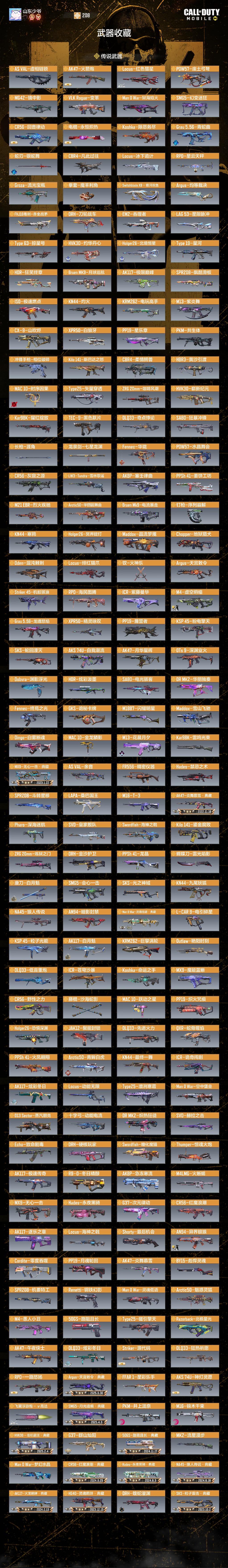 SO-14-万刃灼锋 Type25-万象天梭 RAM-7-星月夜 VMP-幽冥花海 Lw3-tundra-离散单元 XM4-天策含光 USS9-焕光迁跃 JAK12-涅槃炎凤 BP50-日蚀 MG42-永别了战争 Type19-丹青万壑 Grau5.56-源核天灾 CX-9-希尔芙的庇佑 AK117-终墟 FFAR1-无境空刃 SMG5-潮海汐月 DLQ33-红莲天诛