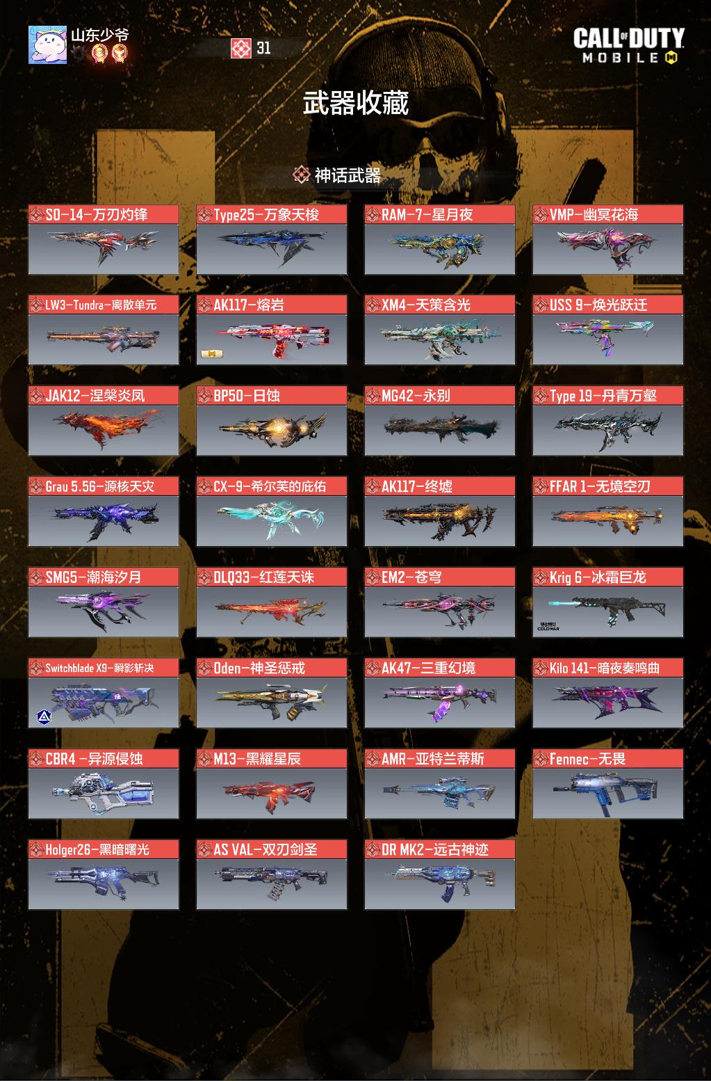EM2-苍穹 Krig6-冰霜巨龙 SwitchbladeX9-瞬影斩决 Oden-神圣惩戒 AK47-三重幻境 Kilo141-暗夜奏鸣曲 CBR4-异源侵蚀 M13-黑耀星辰 AMR-亚特兰蒂斯 Fennec-无畏 Holger26-黑暗曙光 AS VAL-双刃剑圣 DR MK2-远古神迹 AK117-熔岩