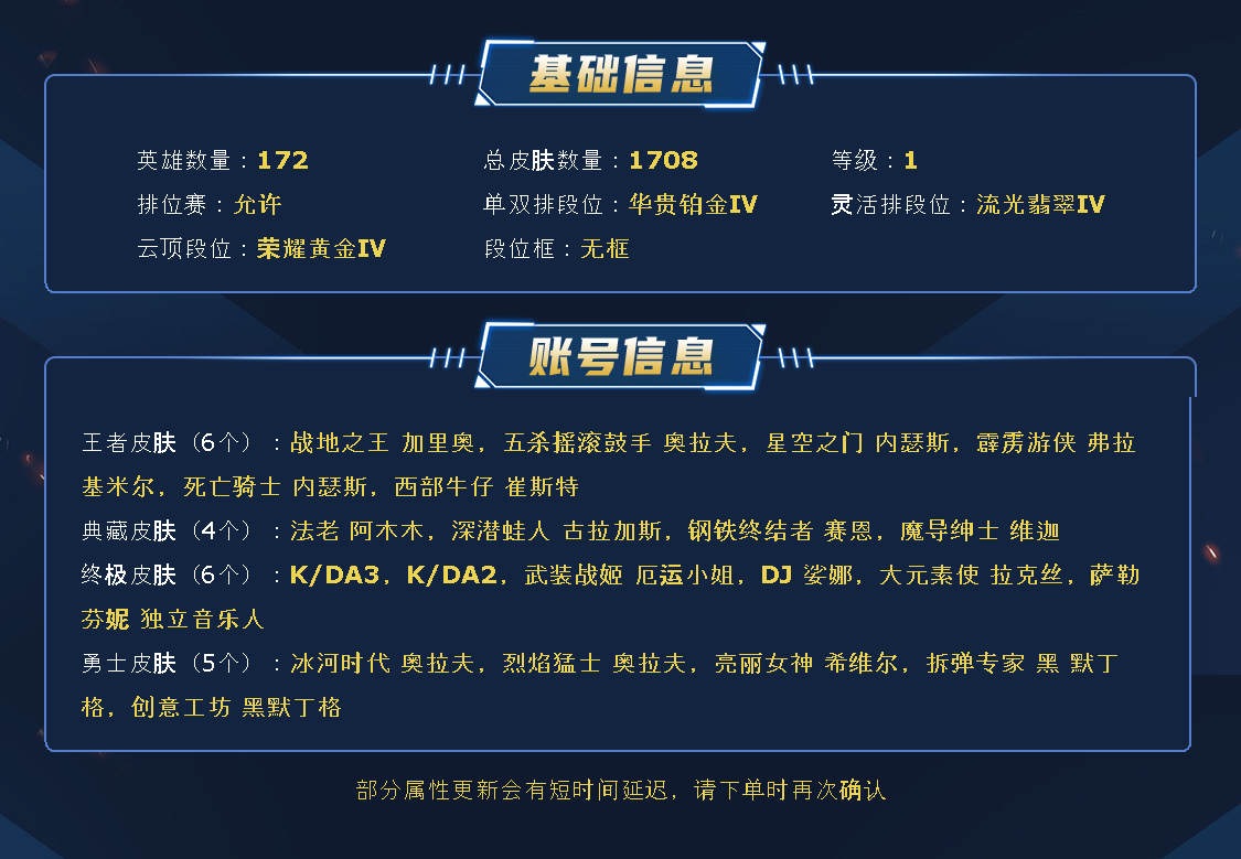 ~~喜欢记得收藏~~可排位~~1663皮全英雄~~租之前尽量查一下游戏ID,确保段位是您需要的,避免浪费您的时间~~请勿挂机逃跑故意送人头,谢谢合作,谢谢~~