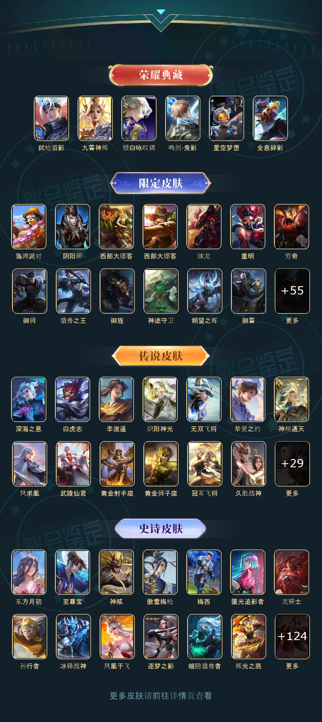贵族等级V10,英雄数量124,典藏皮肤数6,皮肤数量417,星空梦想/全息碎影/鸣剑·曳影
