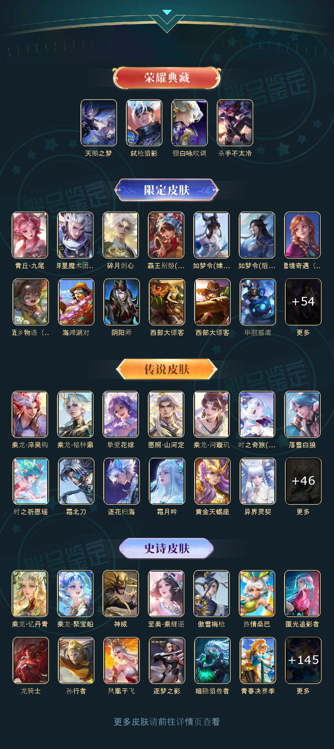 贵族等级V10,英雄数量124,典藏皮肤数4,皮肤数量465,天鹅之梦/杀手不太冷