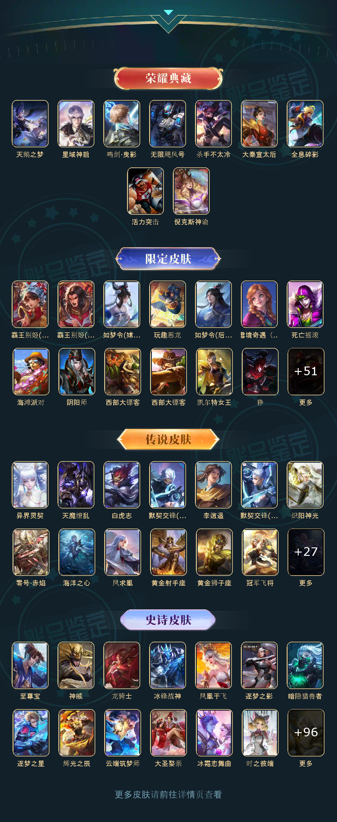贵族等级V10,英雄数量124,典藏皮肤数9,皮肤数量380,天鹅之梦/杀手不太冷/大秦宣太后/无限飓风号/全息碎影/活力突击/倪克斯神谕/鸣剑·曳影/星域神启