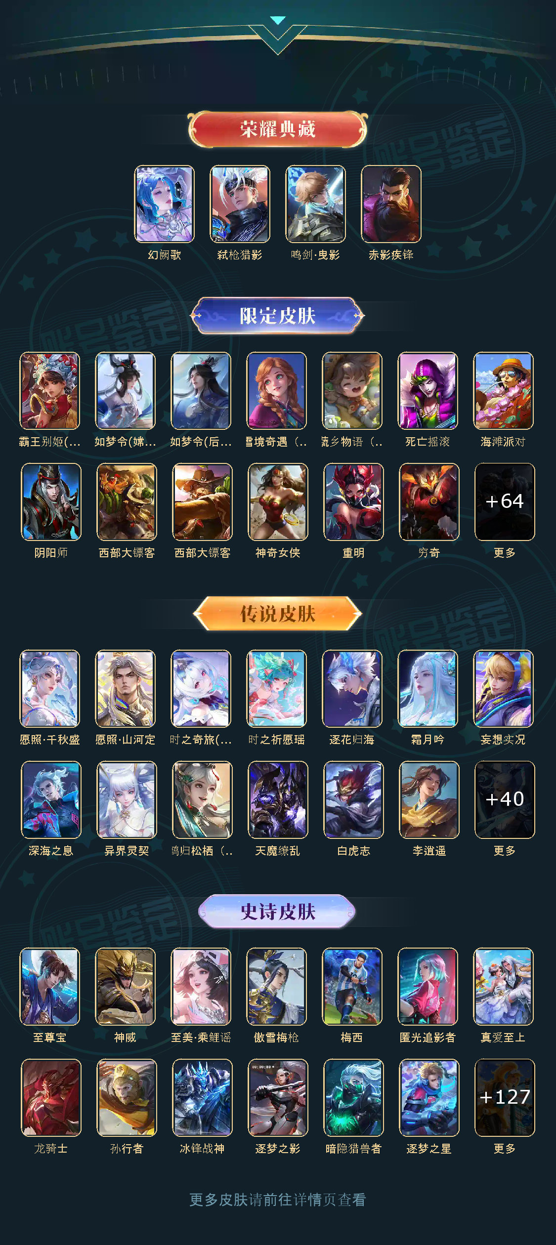 贵族等级V10,英雄数量124,典藏皮肤数4,皮肤数量456,冰锋战神街头霸王天魔缭乱至尊宝真爱至上凤求凰逐梦之影武陵仙君神奇女侠梅西黄金狮子座大圣娶亲冰霜恋舞曲青龙志白虎志朱雀志太华久胜战神飞衡梁祝匿光追影者鸣剑·曳影李逍遥武圣奔雷神使孙行者玉兔公主补天异界灵契神威傲雪梅枪时雨天司