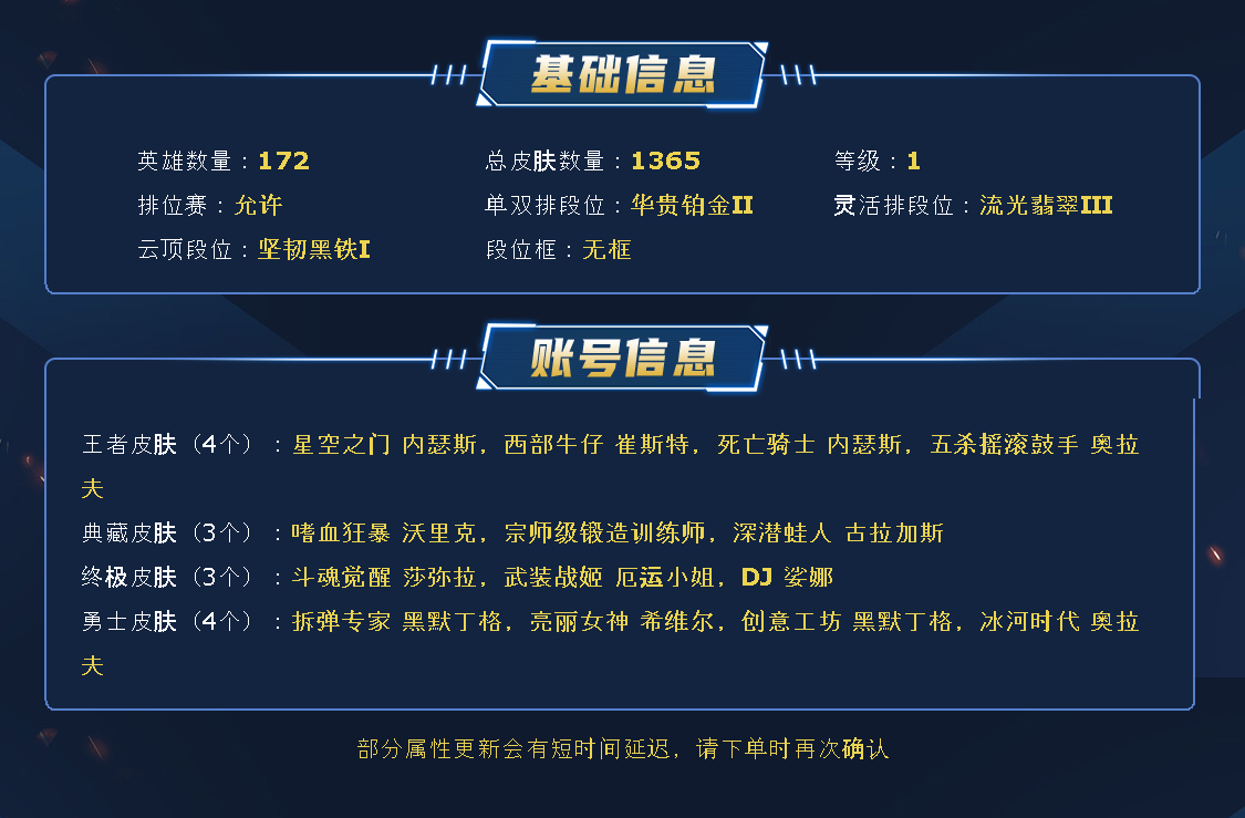 ~~喜欢记得收藏~~可排位~~1295皮全英雄~~租之前尽量查一下游戏ID,确保段位是您需要的,避免浪费您的时间~~请勿挂机逃跑故意送人头,谢谢合作,谢谢~~