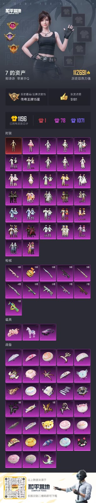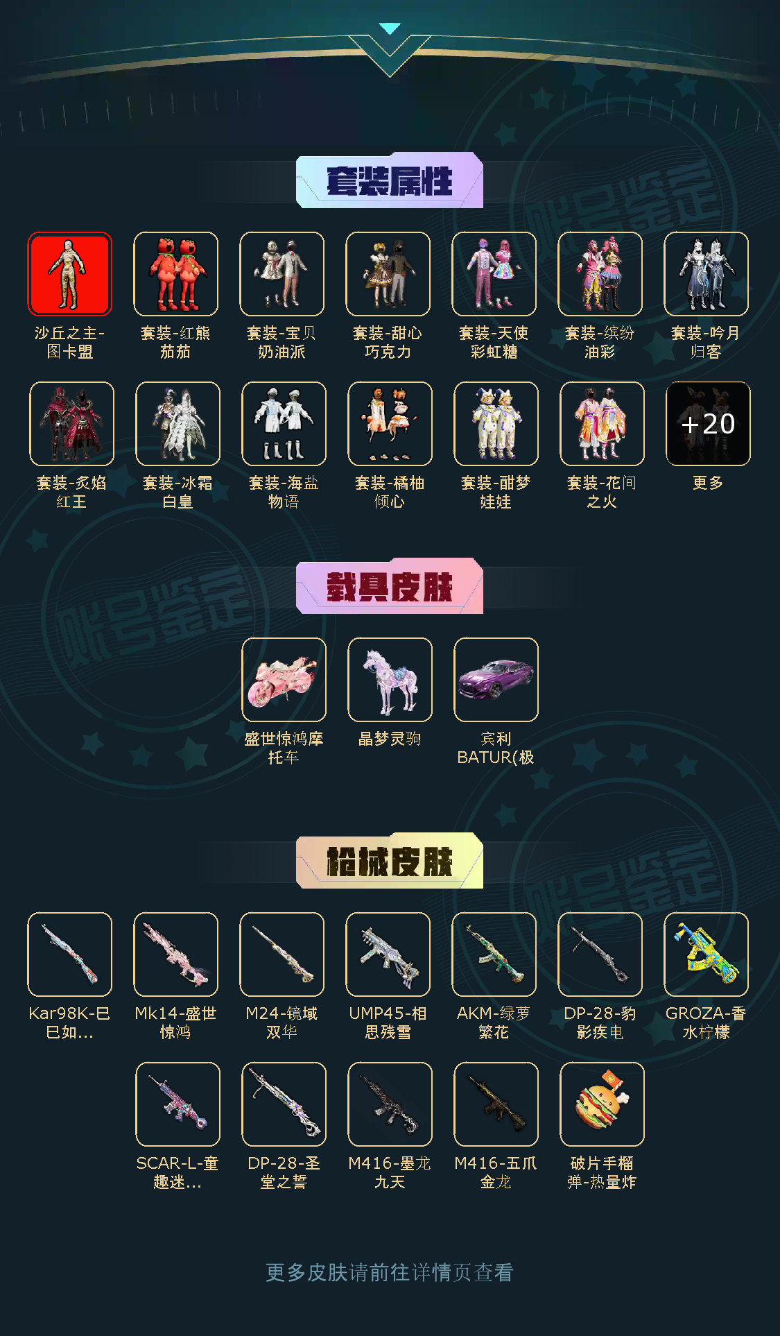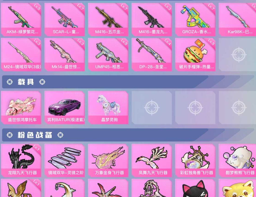 本游戏账号:坚韧铂金Ⅴ段位,特效枪数量10个,粉装数量40套,载具数量12个,优质装备有: AKM-炫紫旋律, AKM-甜心宝贝, SCAR-L-梦幻火箭, M416-心之恋语, M762-甜蜜誓约, Kar98K-伏魔团, AWM-花间之火, 套装-宝贝奶油派, 套装-天使彩虹糖, 套装-梦幻火箭, 套装-精灵迷巫, 套装-金风玉露, 套装-甜蜜誓约, 套装-深海曼妙, 套装-金属狂野, 套装-缤纷油彩, 神秘黑猫降落伞, 梦幻火箭降落伞, 蓝莓炮弹降落伞, 香水柠檬降落伞, 锦绣火鲤降落伞, 炫紫旋律降落伞, 特斯拉Model 3(珍珠白), 阿斯顿·马丁DBS(绿), 深海小丑鱼头盔(3级), 锦绣火鲤头盔(3级), 仓鼠灰灰头盔(3级), 缤纷油彩趣味头盔(3级)等,供您畅选,感受良好游戏体验!