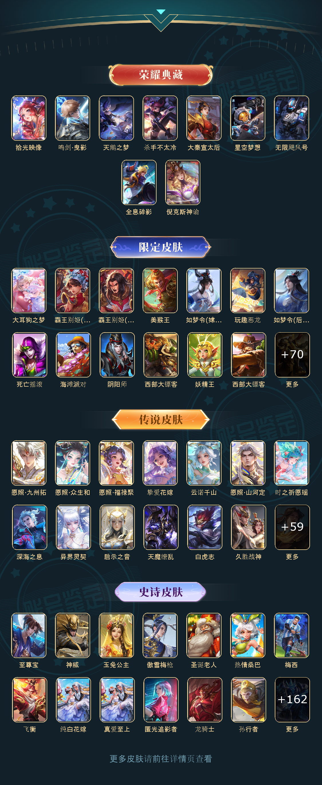 纯白花嫁/天魔缭乱/至尊宝/真爱至上/圣诞老人/热情桑巴/梅西/青龙志/白虎志/朱雀志/久胜战神/飞衡/愿照·九州拓/愿照·众生和/匿光追影者/鸣剑·曳影/愿照·福禄聚/无双飞将/时之祈愿瑶/李逍遥/武圣/雪境奇遇(甄姬)/拾光映像/大耳狗之梦/深海之息/玉兔公主/补天/异界灵契/神威/炽阳神光/启示之音/云诺千山/愿照·山河定/傲雪梅枪/时雨天司/纯白花嫁/天魔缭乱/至尊宝/真爱至上/圣诞老人/热情桑巴/梅西/青龙志/白虎志/朱雀志/久胜战神/飞衡/愿照·九州拓/愿照·众生和/匿光追影者/鸣剑·曳影/愿照·福禄聚/无双飞将/时之祈愿瑶/李逍遥/武圣/雪境奇遇(甄姬)/拾光映像/大耳狗之梦/深海之息/玉兔公主/补天/异界灵契/神威/炽阳神光/启示之音/云诺千山/愿照·山河定/傲雪梅枪/时雨天司