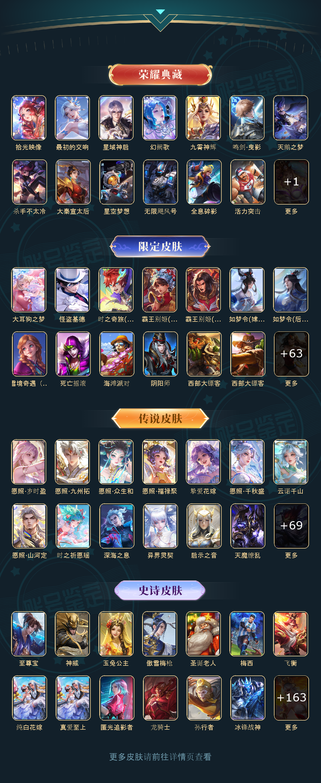 纯白花嫁/天魔缭乱/至尊宝/真爱至上/圣诞老人/梅西/青龙志/白虎志/朱雀志/久胜战神/飞衡/愿照·九州拓/愿照·众生和/匿光追影者/鸣剑·曳影/愿照·福禄聚/无双飞将/时之祈愿瑶/星域神启/李逍遥/武圣/幻阙歌/时之奇旅(孙策)/愿照·千秋盛/雪境奇遇(甄姬)/拾光映像/大耳狗之梦/深海之息/最初的交响/玉兔公主/补天/怪盗基德/愿照·岁时盈/异界灵契/神威/炽阳神光/启示之音/九霄神辉/云诺千山/愿照·山河定/傲雪梅枪/时雨天司/纯白花嫁/天魔缭乱/至尊宝/真爱至上/圣诞老人/梅西/青龙志/白虎志/朱雀志/久胜战神/飞衡/愿照·九州拓/愿照·众生和/匿光追影者/鸣剑·曳影/愿照·福禄聚/无双飞将/时之祈愿瑶/星域神启/李逍遥/武圣/幻阙歌/时之奇旅(孙策)/愿照·千秋盛/雪境奇遇(甄姬)/拾光映像/大耳狗之梦/深海之息/最初的交响/玉兔公主/补天/怪盗基德/愿照·岁时盈/异界灵契/神威/炽阳神光/启示之音/九霄神辉/云诺千山/愿照·山河定/傲雪梅枪/时雨天司