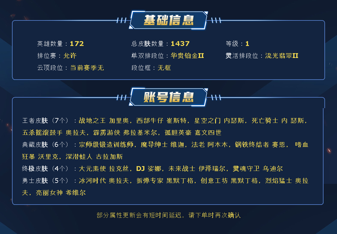~~喜欢记得收藏~~可排位~~1400皮全英雄丨964原皮336炫彩~~租之前尽量查一下游戏ID,确保段位是您需要的,避免浪费您的时间~~请勿挂机逃跑故意送人头,谢谢合作,谢谢~~