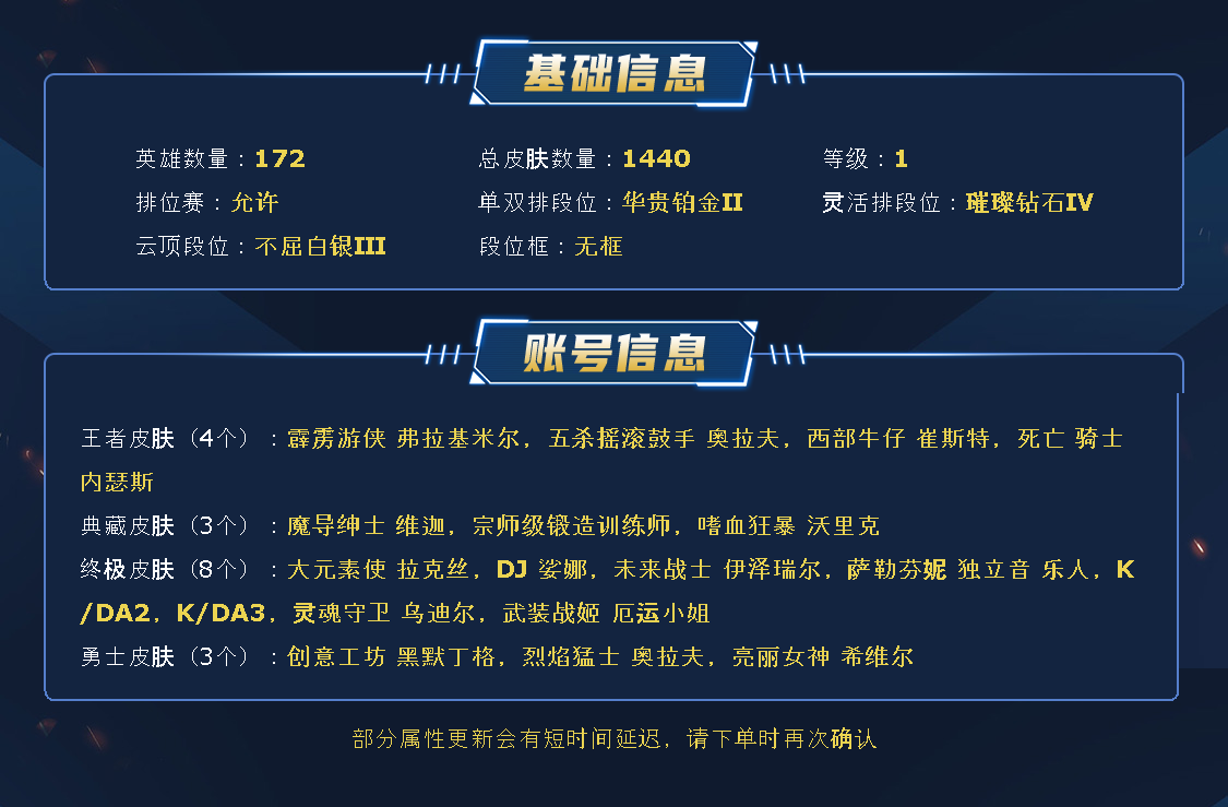 ~~喜欢记得收藏~~可排位~~1300皮全英雄~~租之前尽量查一下游戏ID,确保段位是您需要的,避免浪费您的时间~~请勿挂机逃跑故意送人头,谢谢合作,谢谢~~