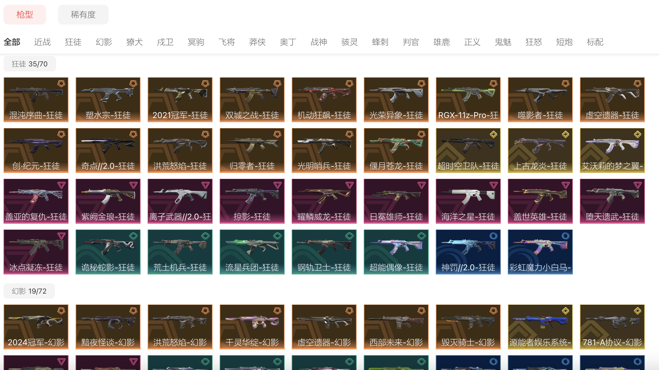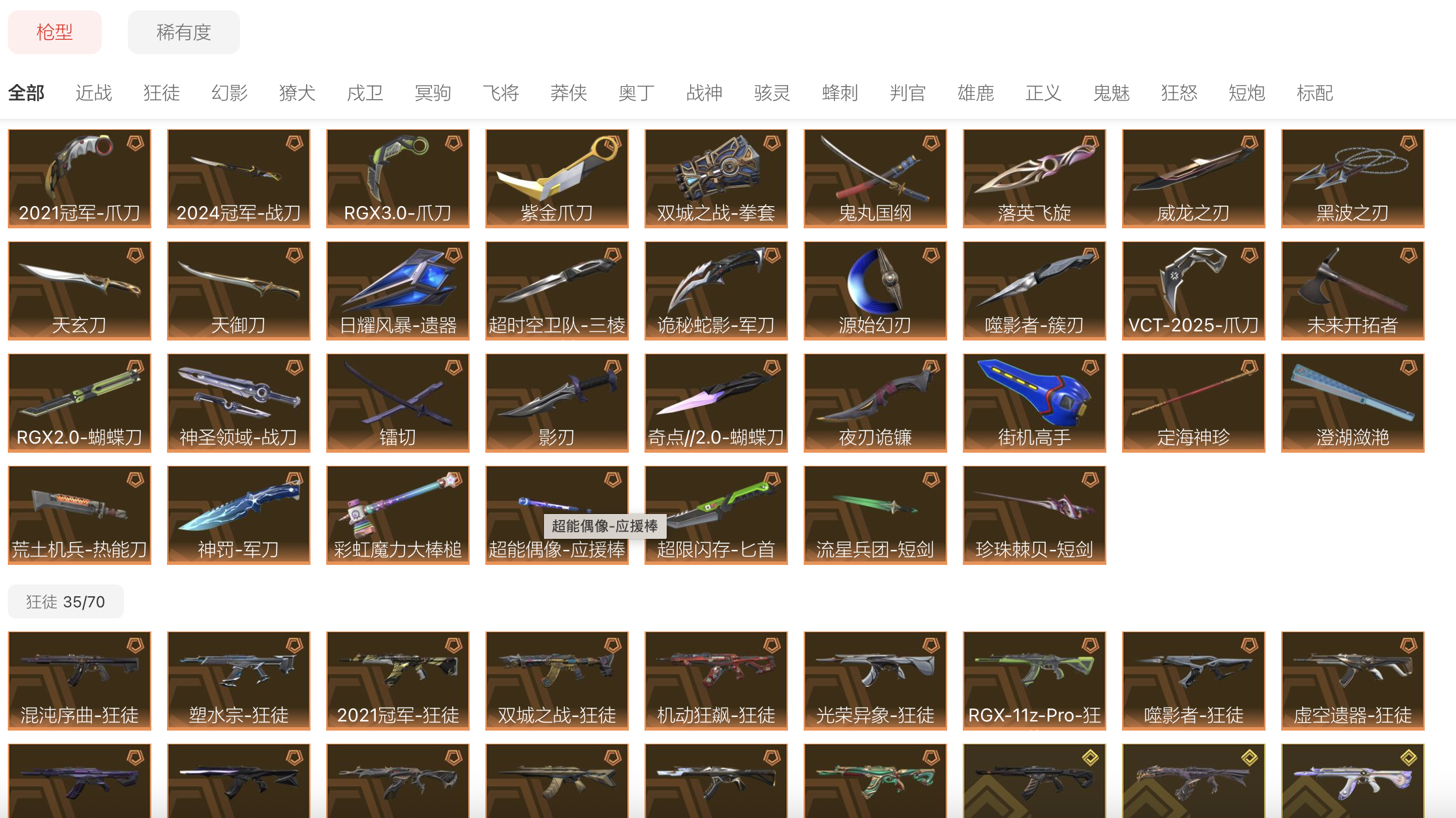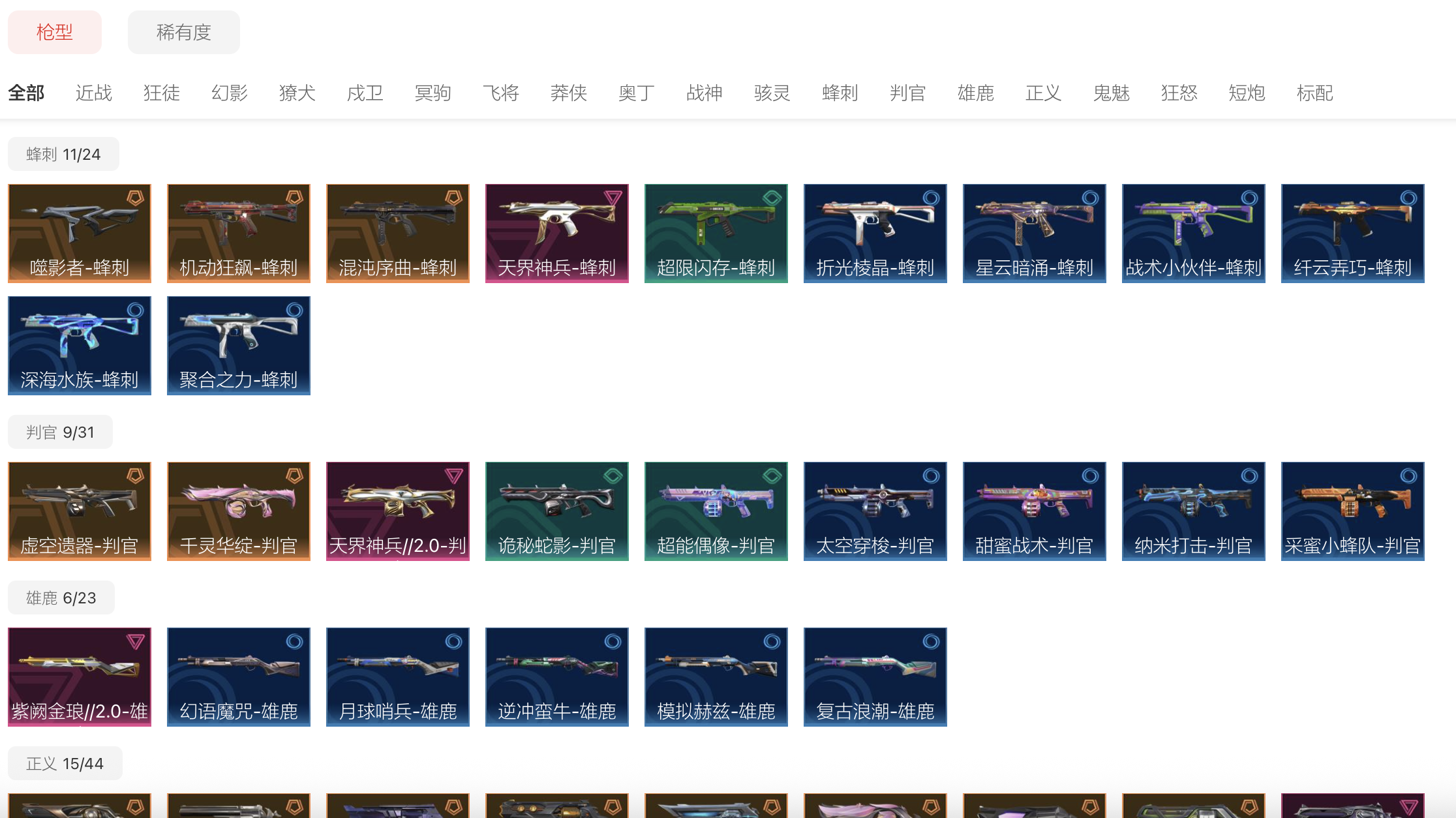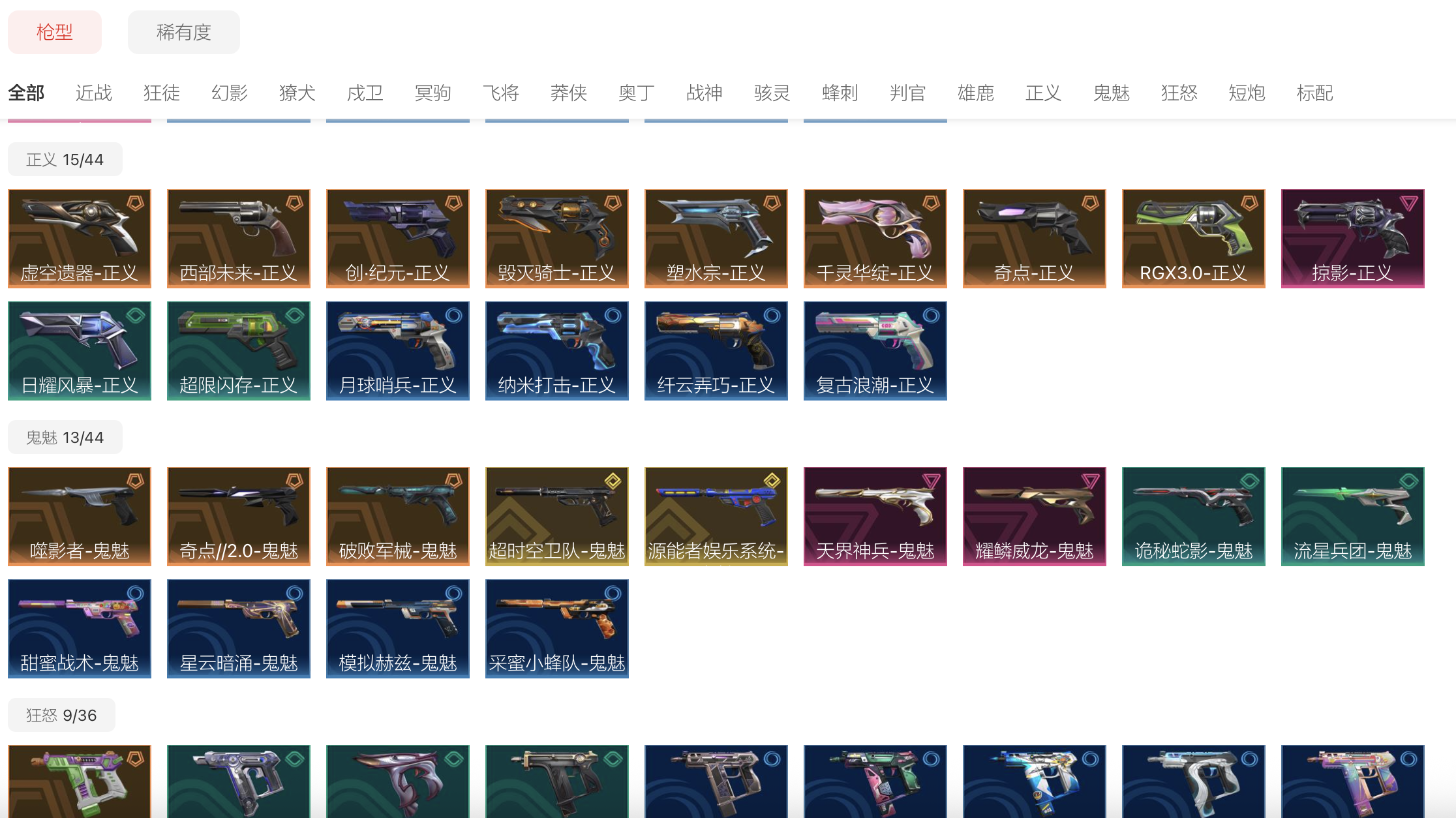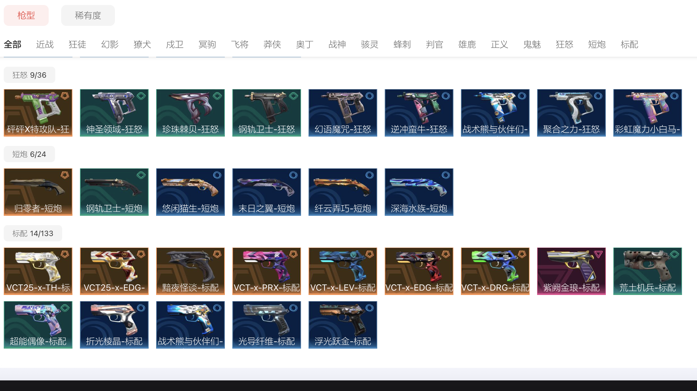 【拥有手枪】VCT25-x-TH-标配,VCT25-x-EDG-标配,VCT-x-DRG-标配,VCT-x-EDG-标配,VCT-x-LEV-标配,VCT-x-PRX-标配,毁灭骑士-正义,破败军械-鬼魅,塑水宗-正义,砰砰X特攻队-狂怒,归零者-短炮,奇点-正义,紫阙金琅-标配,日耀风暴-正义,诡秘蛇影-鬼魅,神圣领域-狂怒,荒土机兵-标配,超限闪存-正义,超能偶像-标配,流星兵团-鬼魅,珍珠棘贝-狂怒,钢轨卫士-短炮,钢轨卫士-狂怒,悠闲猫生-短炮,甜蜜战术-鬼魅,幻语魔咒-狂怒,末日之翼-短炮,折光棱晶-标配,星云暗涌-鬼魅,月球哨兵-正义,纳米daji-正义,逆冲蛮牛-狂怒,模拟赫兹-鬼魅,浮光跃金-标配,彩虹魔力小白马-狂怒,聚合之力-狂怒,采蜜小蜂队-鬼魅,纤云弄巧-正义,战术熊与伙伴们-狂怒,纤云弄巧-短炮,战术熊与伙伴们-标配,复古浪潮-正义,深海水族-短炮,光导纤维-标配,
