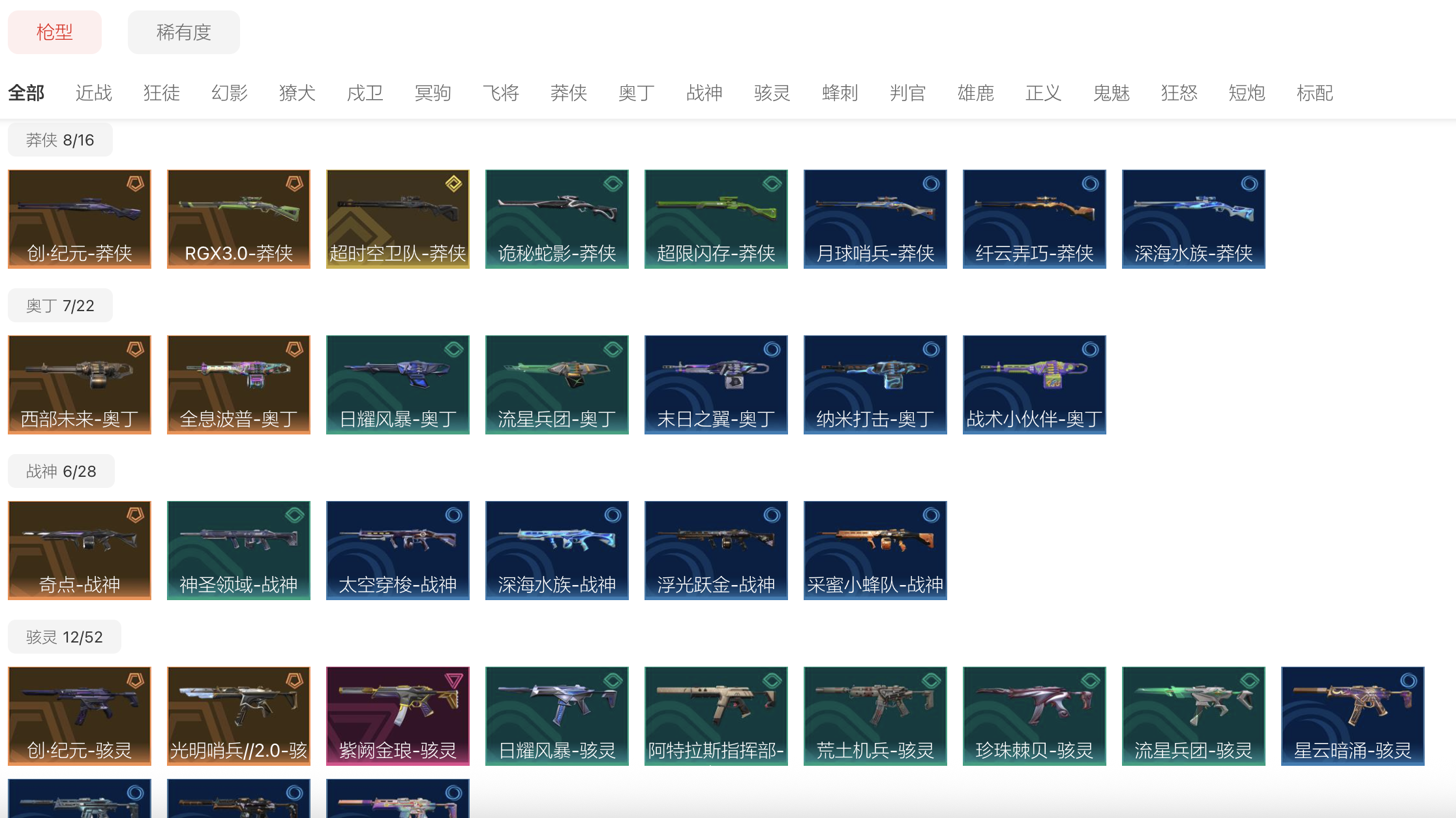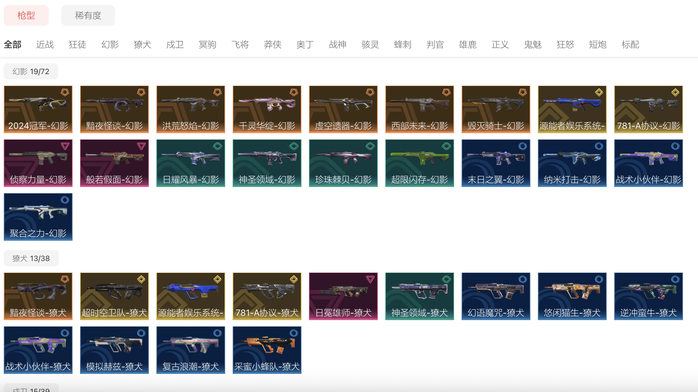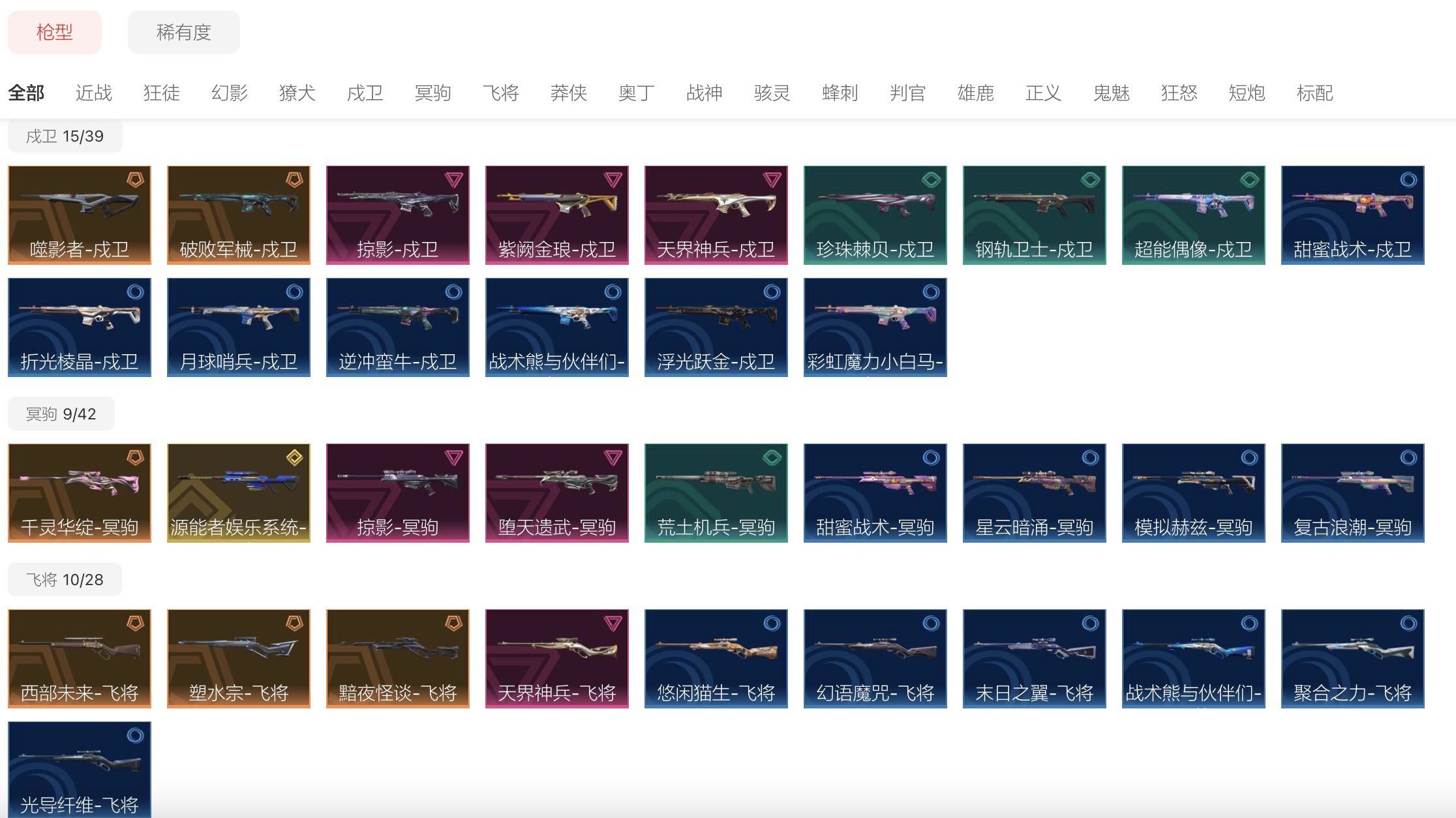 【拥有步枪】光荣异象-狂徒,RGX-11z-Pro-狂徒,光明哨兵-狂徒,混沌序曲-狂徒,毁灭骑士-幻影,洪荒怒焰-狂徒,洪荒怒焰-幻影,破败军械-戍卫,塑水宗-狂徒,机动狂飙-狂徒,归零者-狂徒,偃月苍龙-狂徒,上古龙炎-狂徒,781-A协议-幻影,781-A协议-獠犬,艾沃莉的梦之翼-狂徒,离子武器//2.0-狂徒,堕天遗武-狂徒,盖世英雄-狂徒,紫阙金琅-戍卫,紫阙金琅-狂徒,盖亚的复仇-狂徒,侦察力量-幻影,冰点凝冻-狂徒,般若假面-幻影,海洋之星-狂徒,日冕雄师-狂徒,日冕雄师-獠犬,日耀风暴-幻影,诡秘蛇影-狂徒,神圣领域-獠犬,神圣领域-幻影,荒土机兵-狂徒,超限闪存-幻影,超能偶像-戍卫,超能偶像-狂徒,流星兵团-狂徒,珍珠棘贝-幻影,珍珠棘贝-戍卫,钢轨卫士-狂徒,钢轨卫士-戍卫,悠闲猫生-獠犬,幻语魔咒-獠犬,甜蜜战术-戍卫,神罚//2.0-狂徒,末日之翼-幻影,折光棱晶-戍卫,月球哨兵-戍卫,纳米daji-幻影,逆冲蛮牛-戍卫,逆冲蛮牛-獠犬,模拟赫兹-獠犬,浮光跃金-戍卫,彩虹魔力小白马-狂徒,彩虹魔力小白马-戍卫,聚合之力-幻影,采蜜小蜂队-獠犬,战术熊与伙伴们-戍卫,复古浪潮-獠犬,战术小伙伴-獠犬,战术小伙伴-幻影,