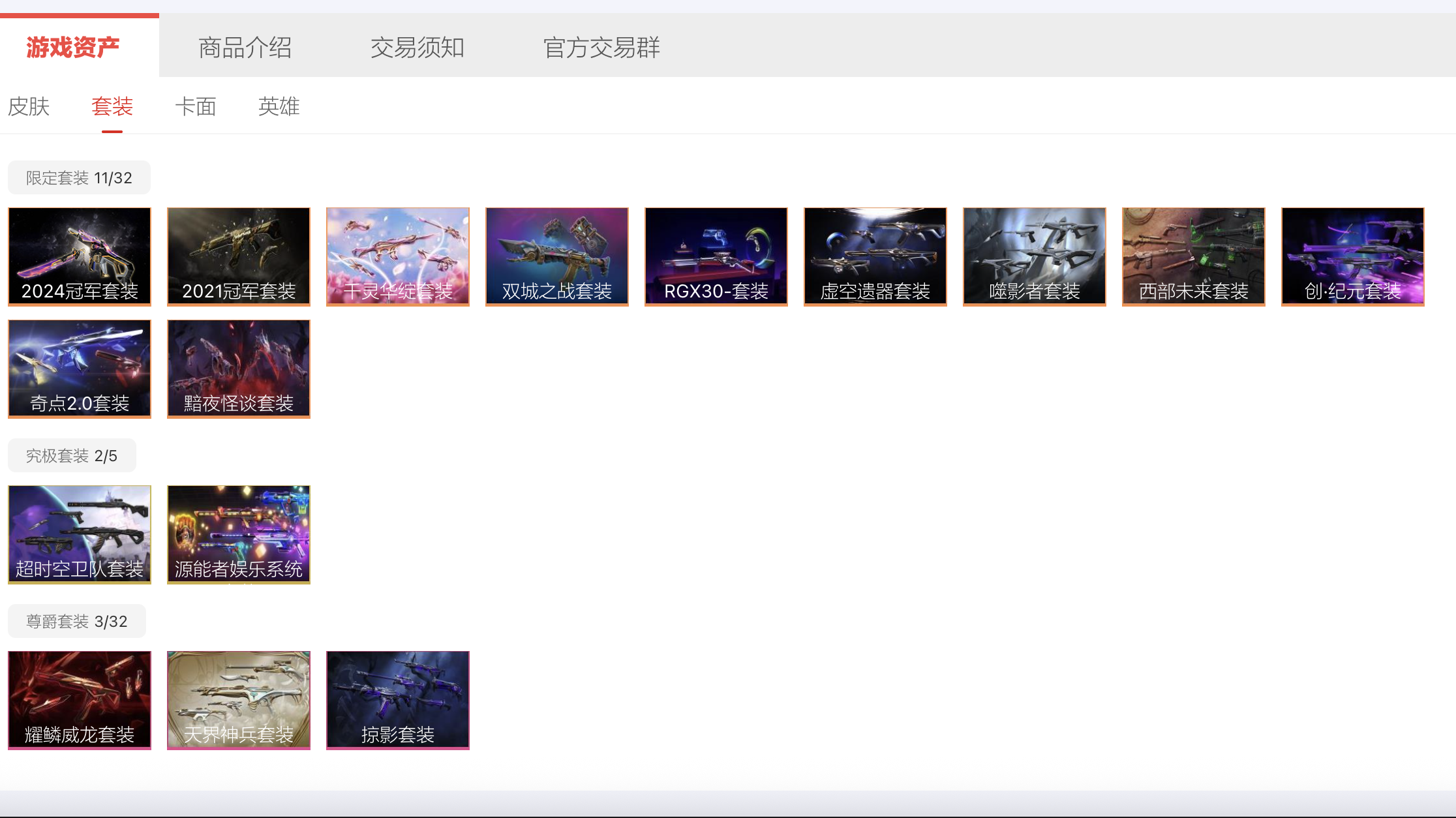 【拥有套装】超时空卫队套装(超时空卫队-狂徒,超时空卫队-獠犬,超时空卫队-莽侠,超时空卫队-鬼魅,超时空卫队-三棱军刺)虚空遗器套装(虚空遗器-狂徒,虚空遗器-幻影,虚空遗器-判官,虚空遗器-正义,源始幻刃)噬影者套装(噬影者-狂徒,噬影者-戍卫,噬影者-蜂刺,噬影者-鬼魅,噬影者-簇刃)西部未来套装(西部未来-幻影,西部未来-奥丁,西部未来-飞将,西部未来-正义,未来开拓者)创纪元套装(创·纪元-狂徒,创·纪元-莽侠,创·纪元-骇灵,创·纪元-正义,镭切)双城之战套装(双城之战-狂徒,双城之战-拳套)千灵华绽套装(千灵华绽-幻影,千灵华绽-冥驹,千灵华绽-判官,千灵华绽--正义,落英飞旋)黯夜怪谈套装(黯夜怪谈-幻影,黯夜怪谈-獠犬,黯夜怪谈-飞将,黯夜怪谈-标配,夜刃诡镰)奇点2.0套装(奇点//2.0-狂徒,奇点//2.0-鬼魅,奇点//2.0-蝴蝶刀)2024全球冠军赛套装(2024全球冠军赛-幻影,2024全球冠军赛-战刀)2021全球冠军赛套装(2021全球冠军赛-狂徒,2021全球冠军赛-爪刀)RGX-11z-Pro//3.0套装(RGX-11z-Pro//3.0-莽侠,RGX-11z-Pro//3.0-正义,RGX-11z-Pro//3.0-爪刀)天界神兵套装(天界神兵-戍卫,天界神兵-飞将,天界神兵-蜂刺,天界神兵-鬼魅,天玄刀)耀鳞威龙套装(耀鳞威龙-狂徒,耀鳞威龙-鬼魅,威龙之刃)源能者娱乐系统套装(源能者娱乐系统-幻影.源能者娱乐系统-冥驹,源能者娱乐系统-獠犬,源能者娱乐系统-鬼魅,街机高手)掠影套装(掠影-狂徒,掠影-冥驹,掠影-戍卫,掠影-正义,影刃)