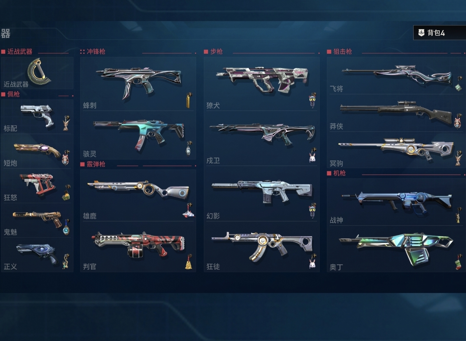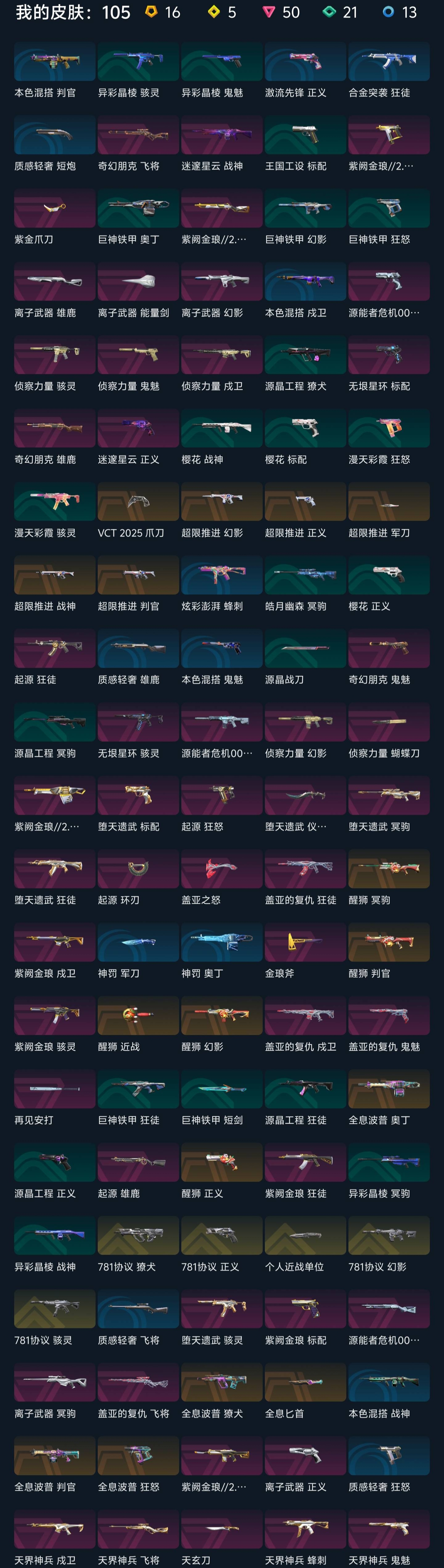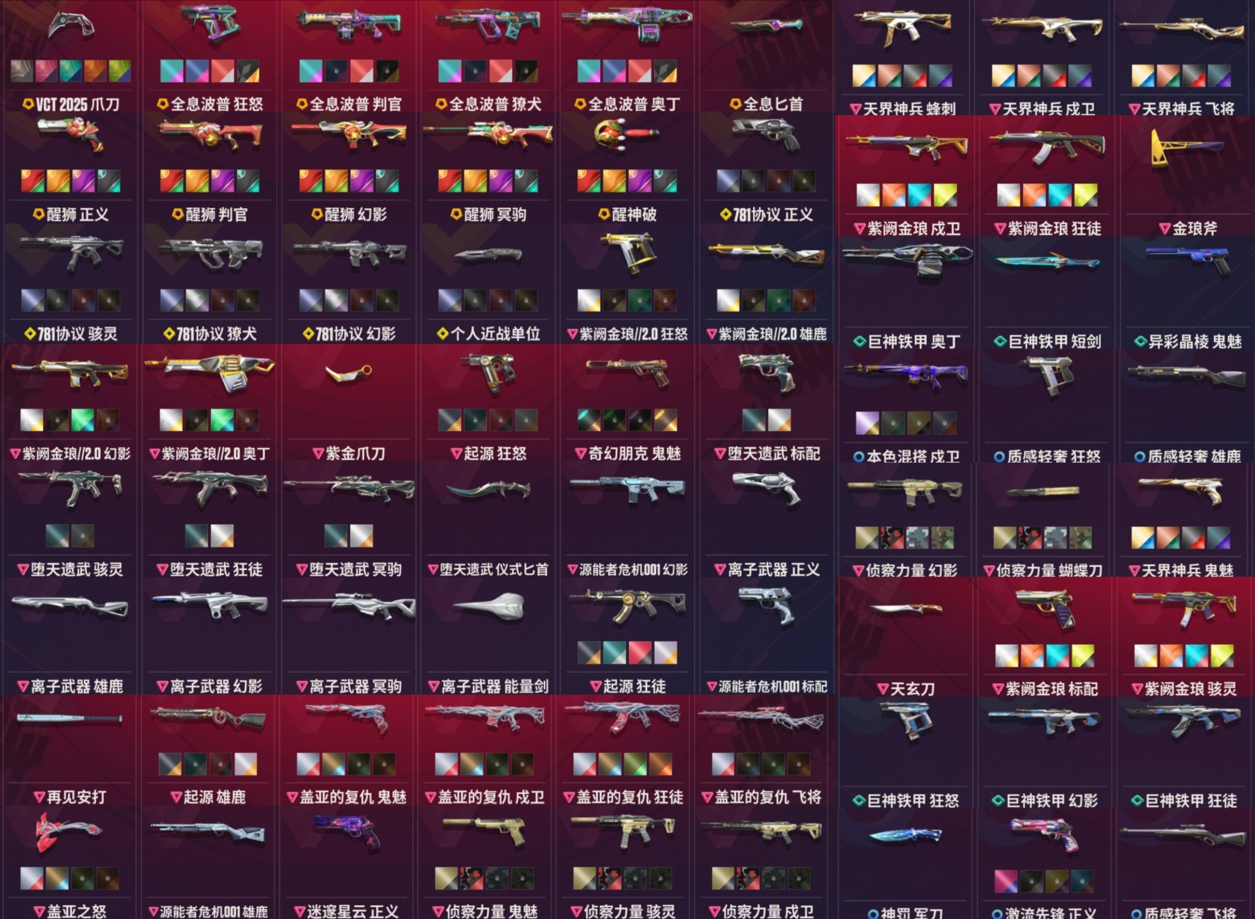近战武器:vct2025爪刀满级全炫彩(vct爪刀)/狂沙之拥2级天穹/起源环刃2级/紫金爪刀2级/澄湖涟滟2级鱼扇/沧澜戟2级深蓝/偃月2级/推进模式前进四2级银蓝/堕天遗武仪式匕首2级/个人近战单位满级/离子武器能量剑2级/盖亚之怒2级蓝色/全息匕首2级/醒神破2级全炫彩/天玄刀2级/侦察力量蝴蝶刀2级全炫彩(侦察蝴蝶刀)/金琅斧2级/再见安打2级/巨神铁甲短剑