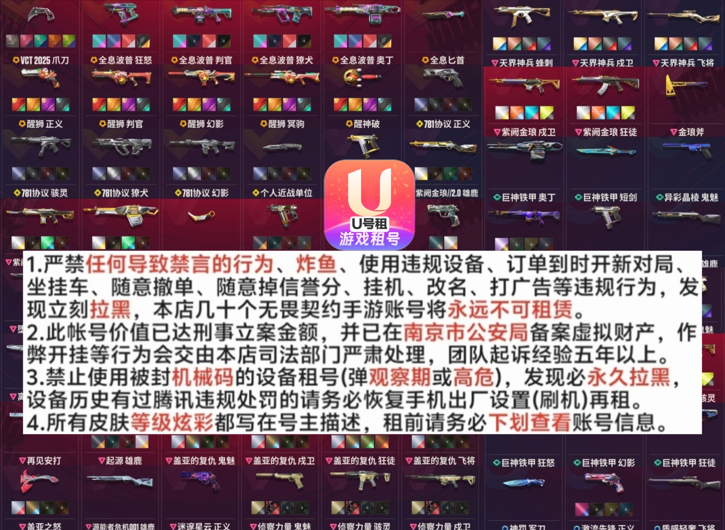 1.严禁任何导致禁言的行为、炸鱼、使用违规设备、订单到时开新对局、坐挂车、随意撤单、随意掉信誉分、挂机、改名、打广告等违规行为,发现立刻拉黑,本店几十个无畏契约手游账号将永远不可租赁。